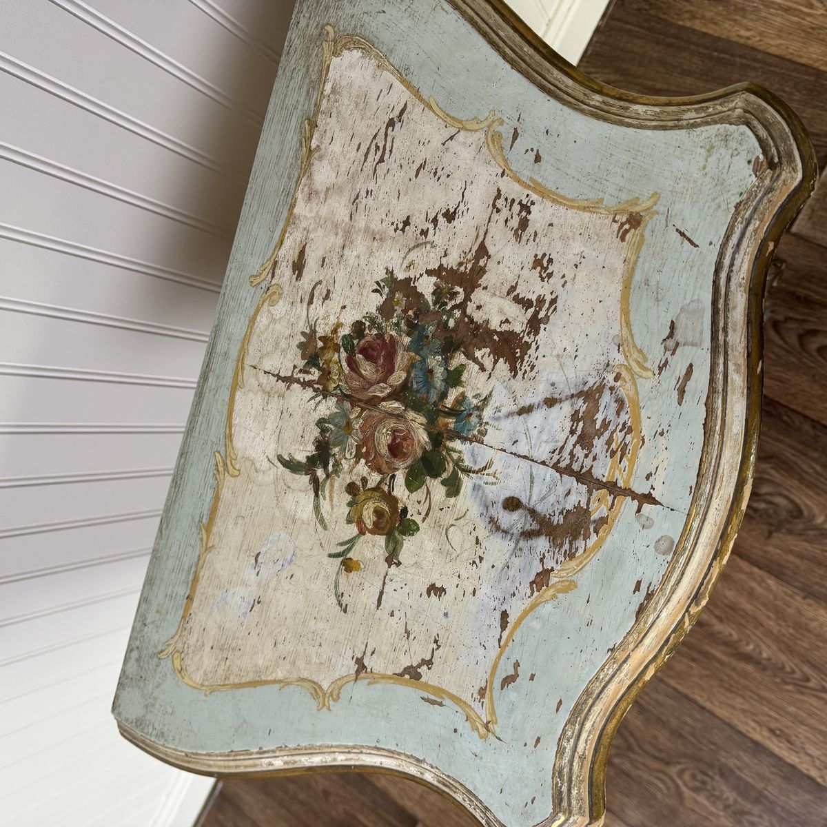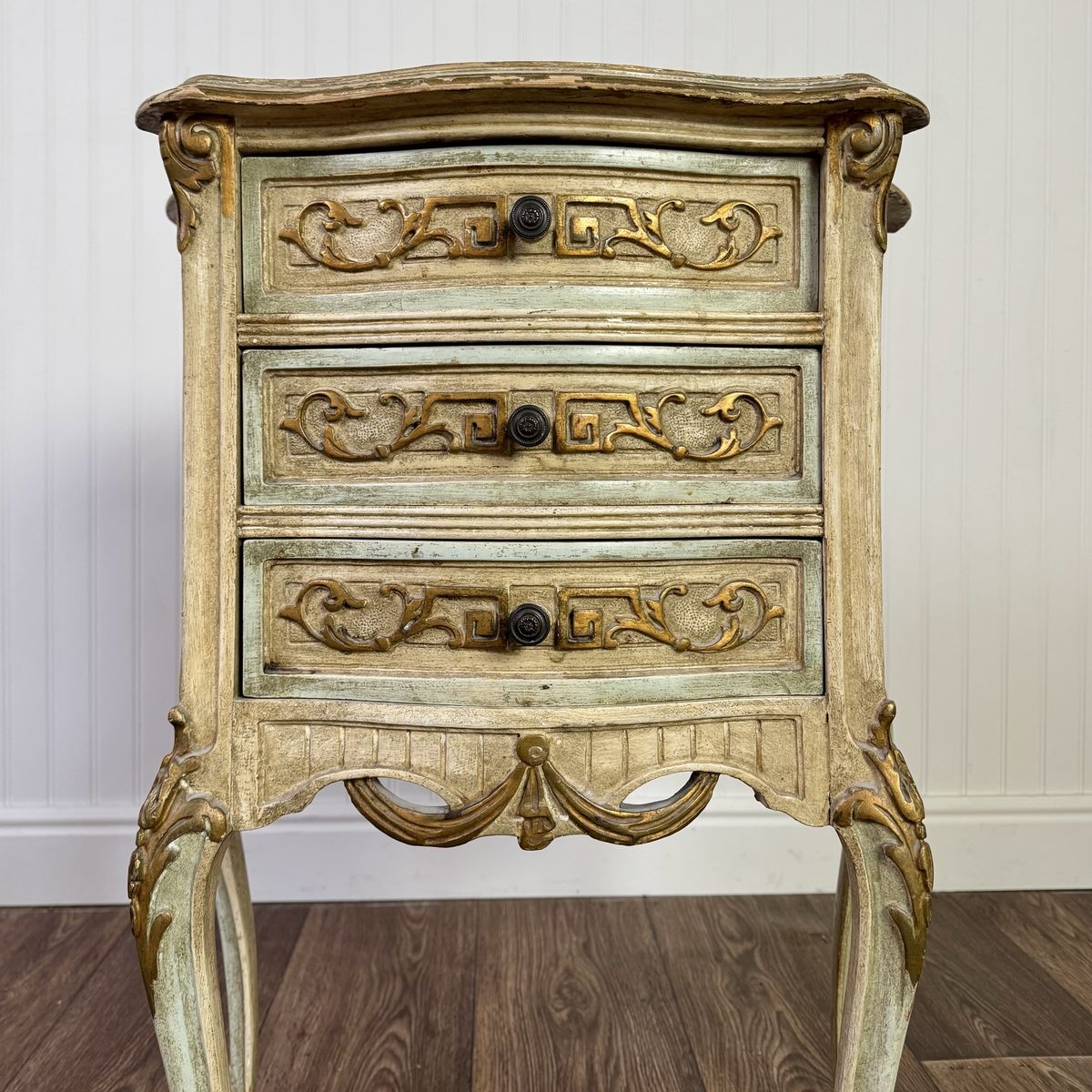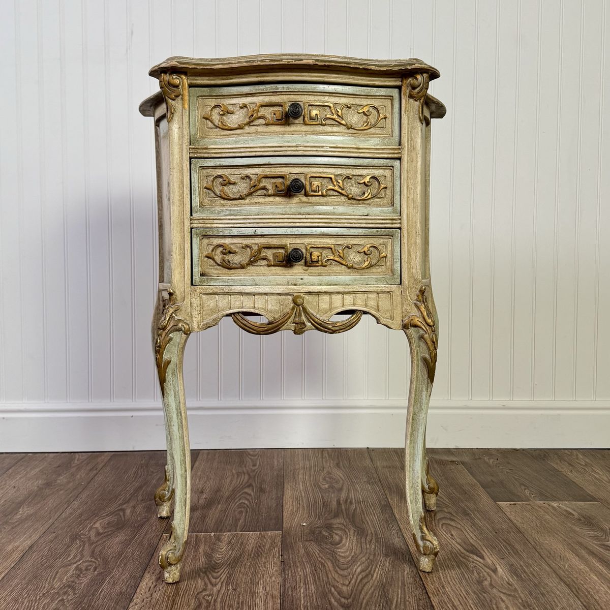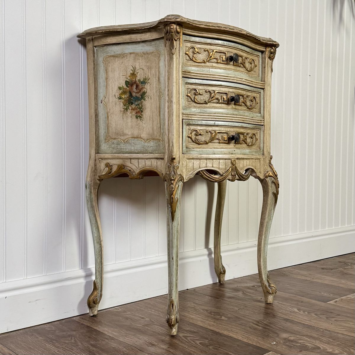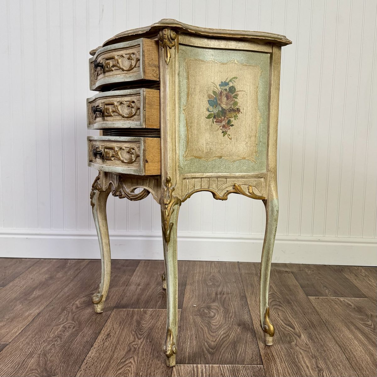 VenmoCharming vintage Venetian-style petite chest featuring a romantic distressed finish in sage green and cream, accented with elegant gold leaf trim and hand-painted floral bouquets. This mid-century era piece has graceful cabriole legs and is adorned with ornate neoclassical carvings and original hardware.