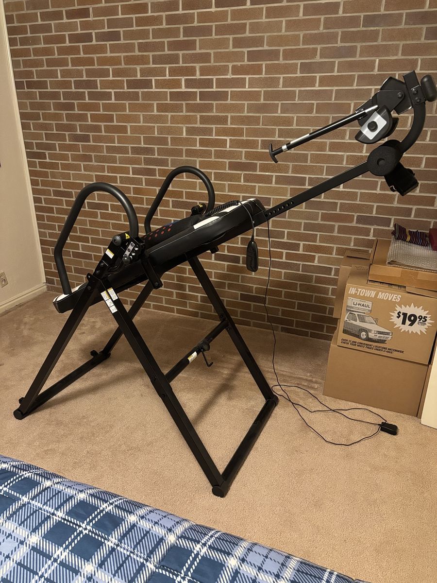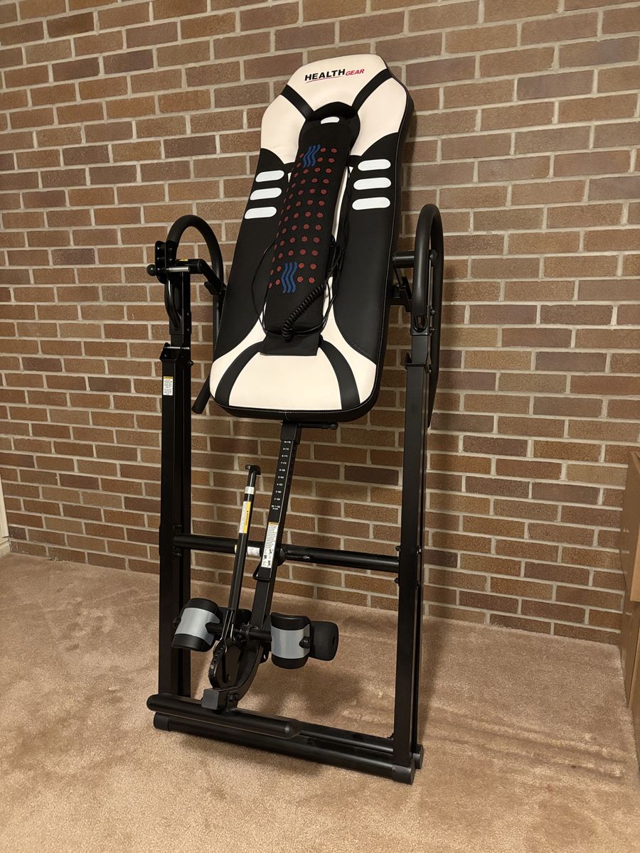 VenmoHealth Gear inversion table. Use to decompress the spine and relieve back pain and soreness, sciatica, etc. Optional (removable) heat and massage pad. Table folds up for easy storage. Like new; purchased 3 years ago and barely used. Three inversion settings – 20°, 40°, and 60°. Heat and massage pad plugs in, with handheld controller to adjust settings for heat and massage intensity.