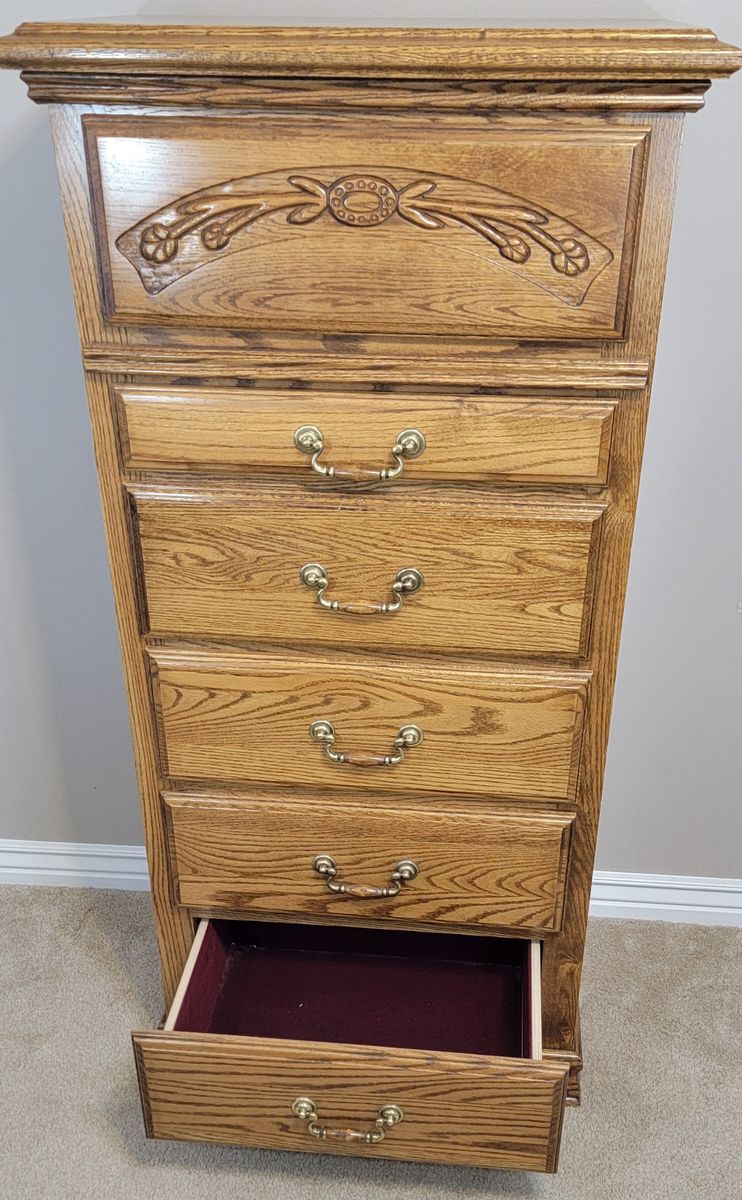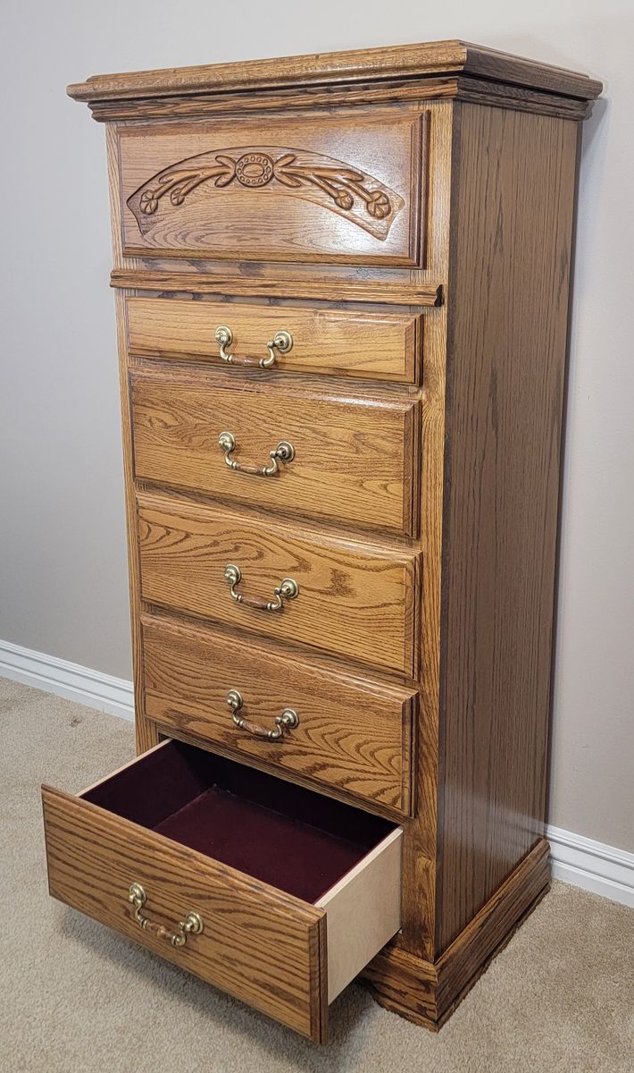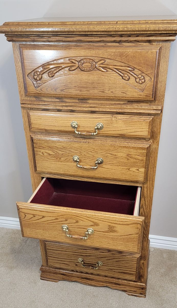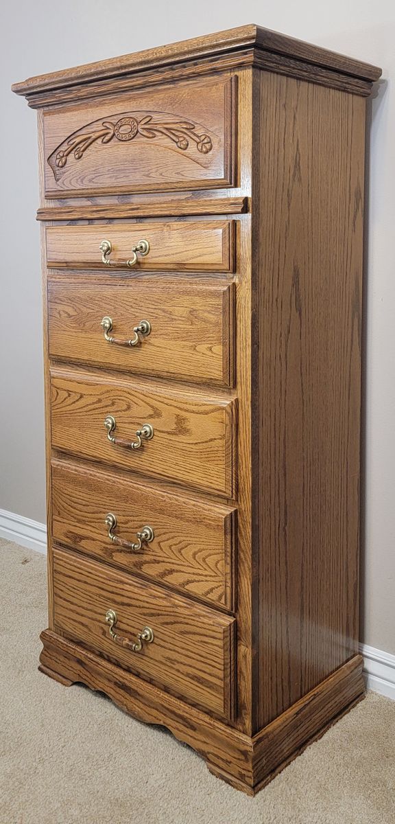 Selling this gorgeous, high-quality solid oak lingerie dresser. This is a vintage "Master-piece Collection" style piece, known for its durability and classic craftsmanship. Perfect for small spaces or adding elegant vertical storage to a bedroom!