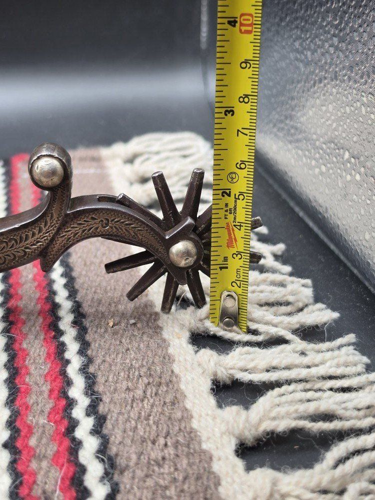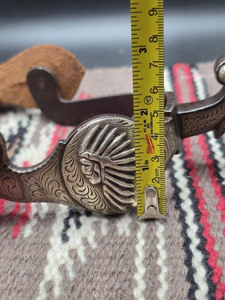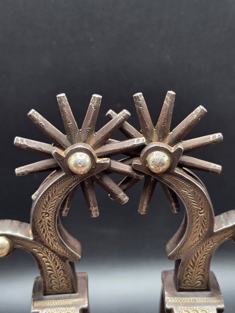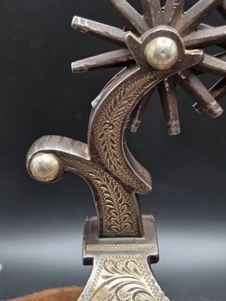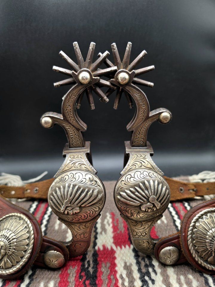 VenmoThese are some of the best lookin' spurs I've come across. The quality of the engraving work is outstanding, and they match these rare 101 ranch sterling conchos! From doing research, the conchos were custom souvenir pieces the ranch produced in the early 1900's. These are very hard to find. I was only able to find evidence of one other set being sold a handful of years ago. My assumption is that these spurs were made to match the conchos, but cannot find proof of these spurs belonging to a member of the ranch or the cast. As an added bonus.. I've included a $20 bill that was used as ranch currency, and an old show ticket for the 101 Ranch Round-up from 1940! These spurs appear to be unused, like they've just been on display since the 50's.