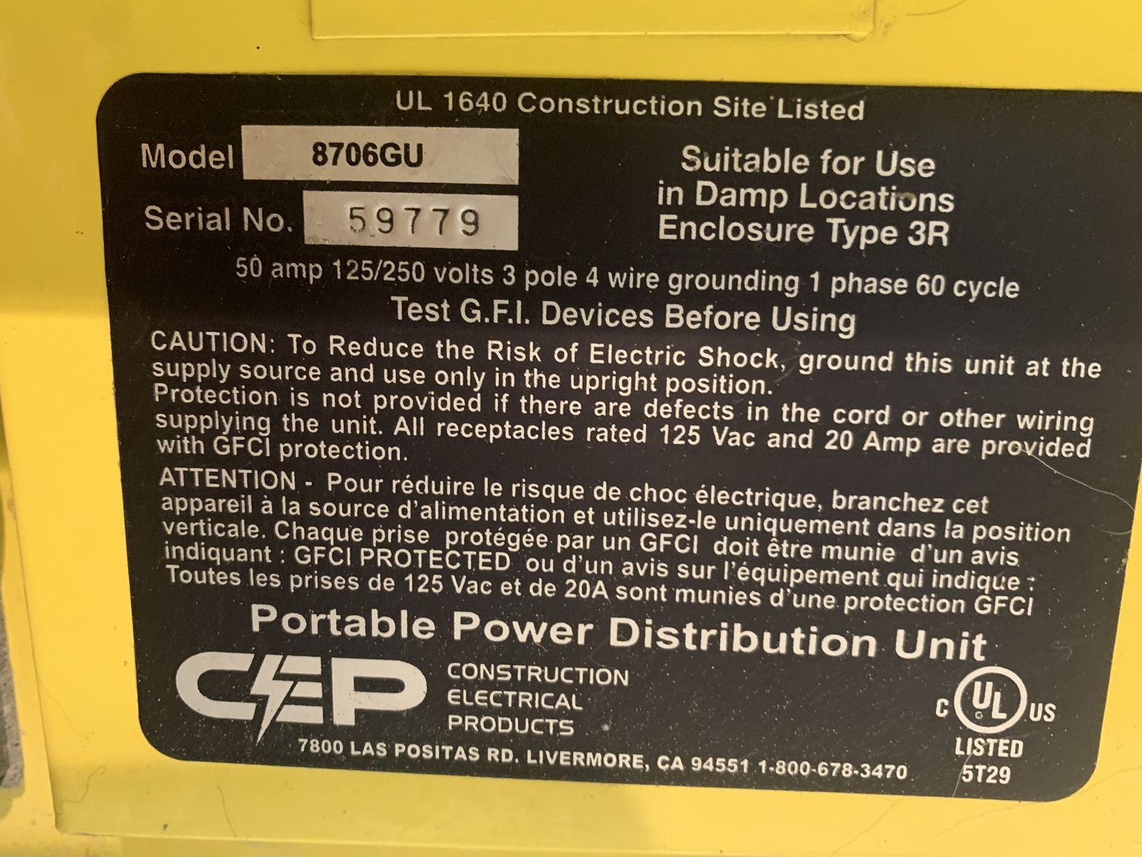CEP spider box, portable power distribution center 50 amp, model 8706gu, gfi protected