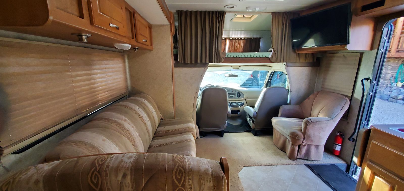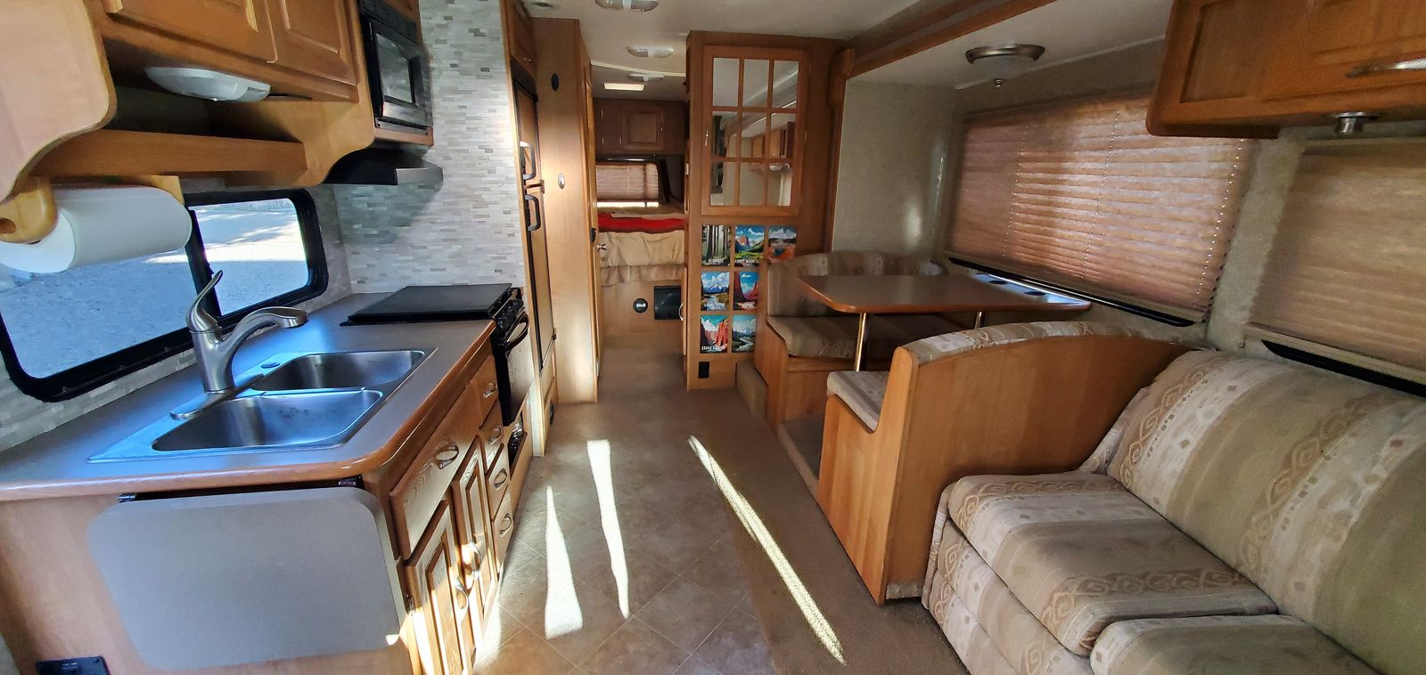 Interior...kitchen wall has custom tile on entire area. Lots of little repairs that are cosmetic. New floor matts and seat covers All appliances work perfect. New cover dor stove to increase space. Master bed has upgraded mattress. Included topper.for other bed. Includes newer TV and dvd player. Custom utah park art inlays.