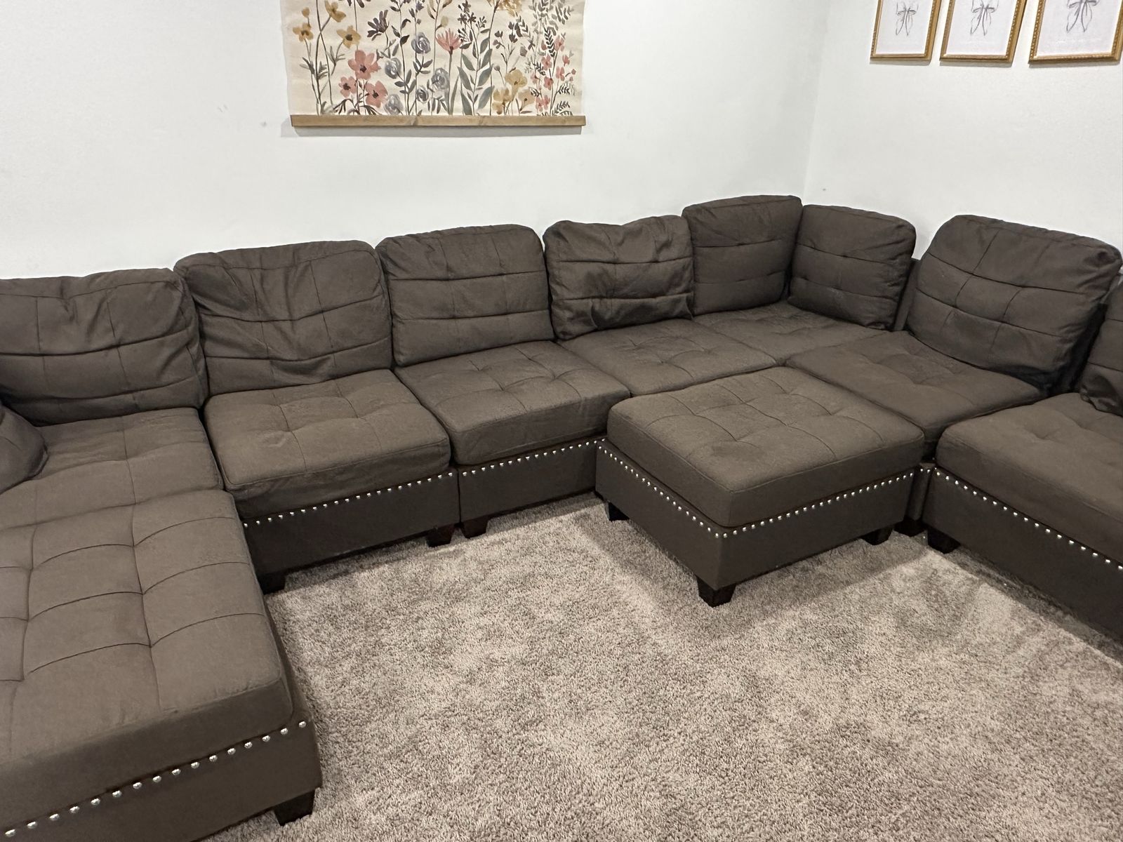 Brown modular sectional couch for sale. In good condition with the exception of a small tear in the ottoman cushion and zippers have come off of the bottom of two of the back cushions, as pictured. Great for a large family! Able to have multiple configurations.