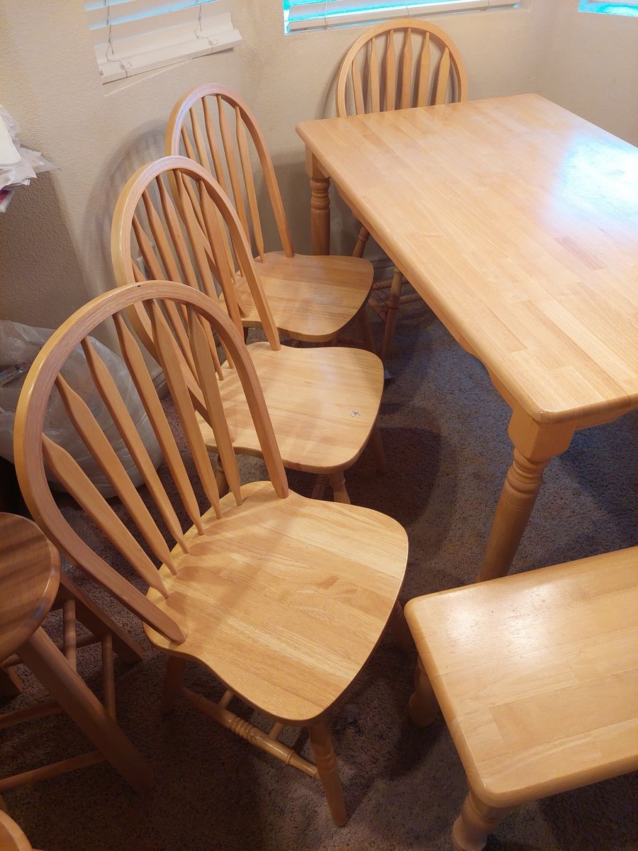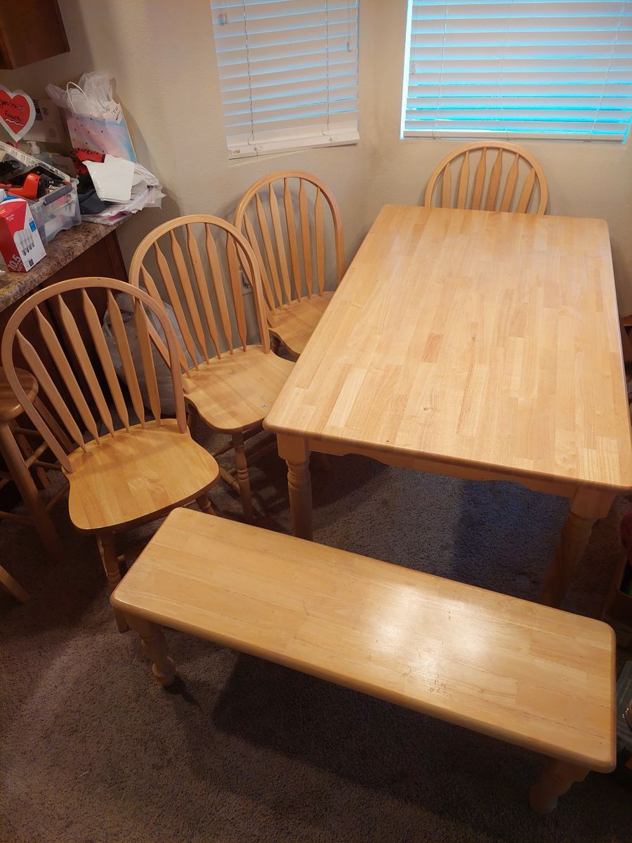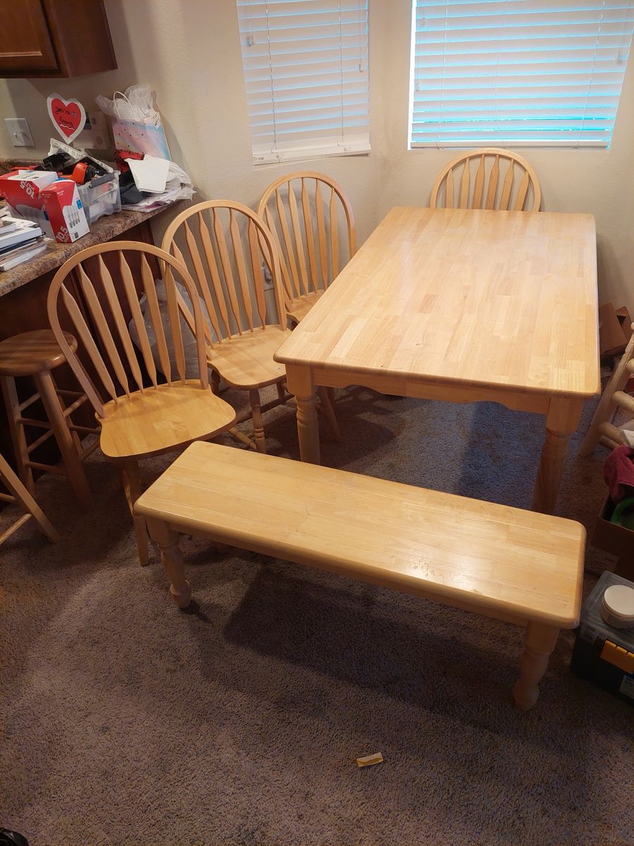 VenmoTable measures 60"×36" 29" tall. Chairs back Height 37" 17.5" wide 17" seat height. Bench 4 chairs and Bench 46" long 14" wide 18" seat