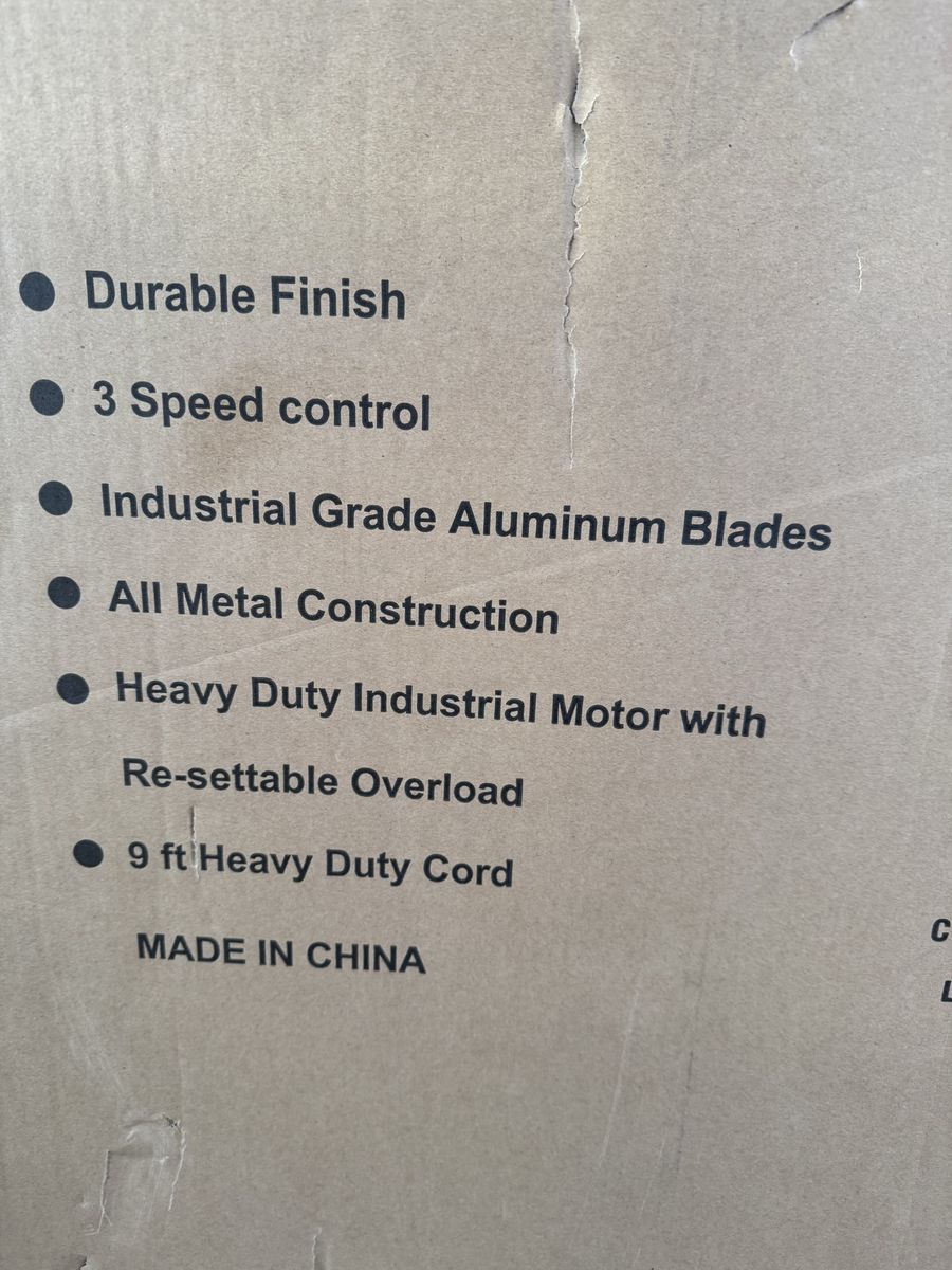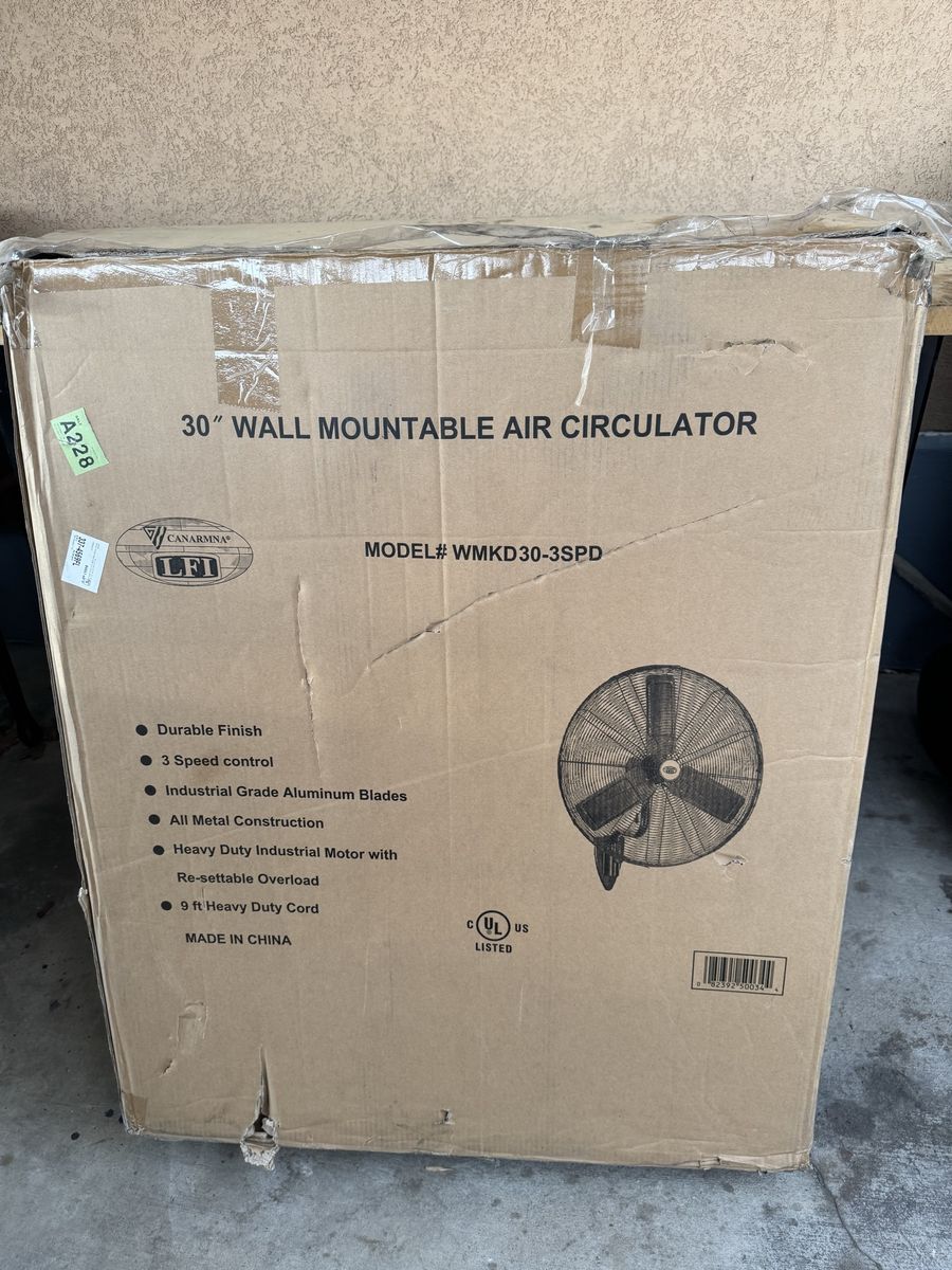 New Canarmna LFI 30" Wall-Mountable Air Circulator Model #WMKD30-3DPD A new 30-inch industrial air circulator fan by TPI Corporation, designed for wall mounting (Model WMKD30-3SPD). Features: Equipped with a heavy-duty industrial motor featuring a resettable overload protector, industrial-grade aluminum blades, and all-metal construction. Speed and Airflow: Offers 3 speed settings and an airflow capacity of up to 6,000 cubic feet per minute (CFM). Technical Specifications: Operates on 120 volts, single-phase power, and includes a 9-foot heavy-duty power cord. Price: The approximate retail price for similar models is $474.24 USD. $150 Accept only in cash