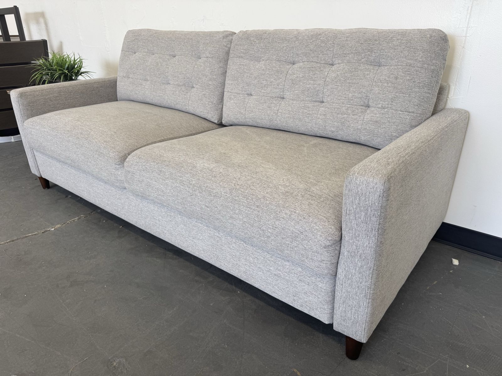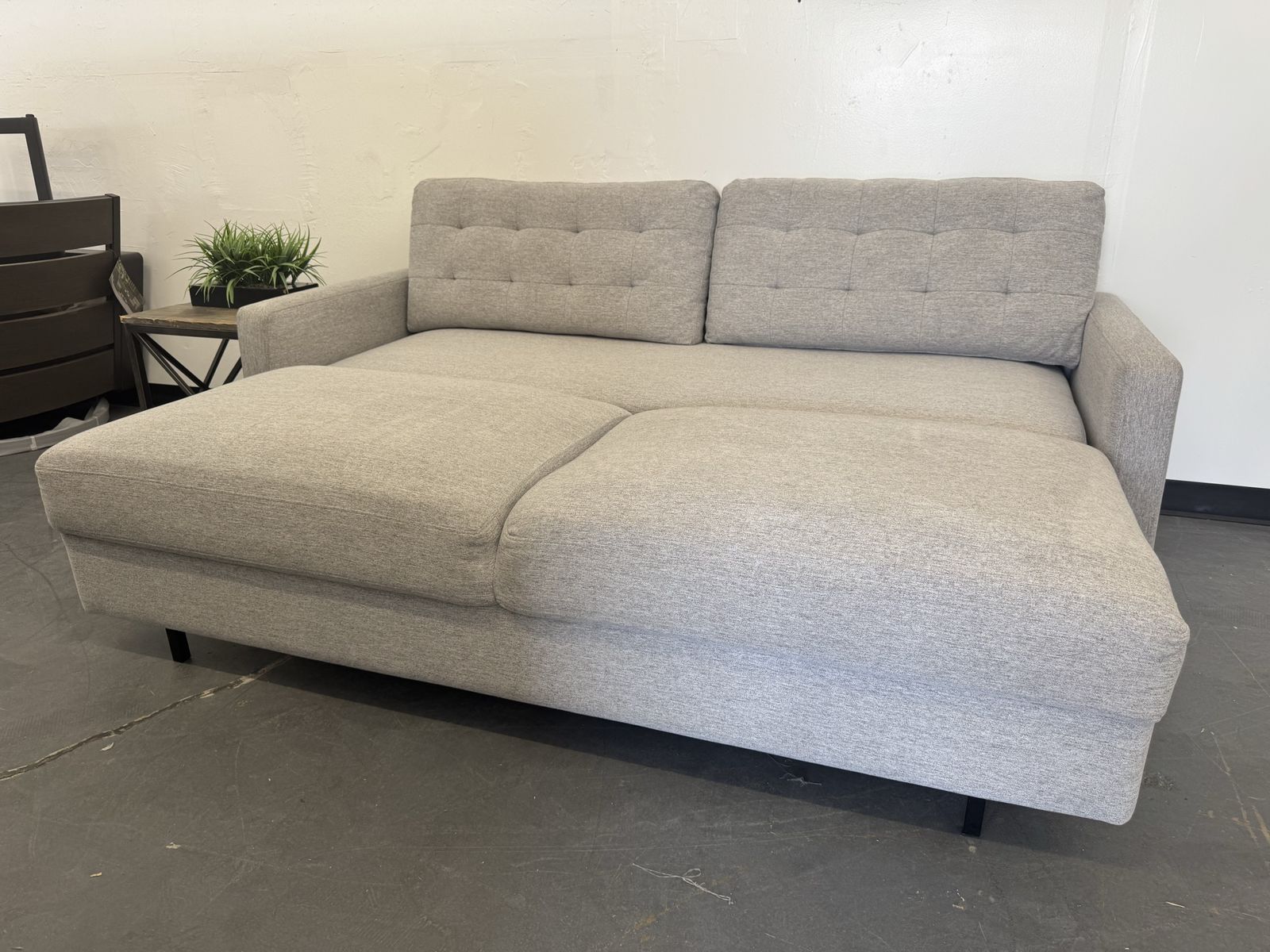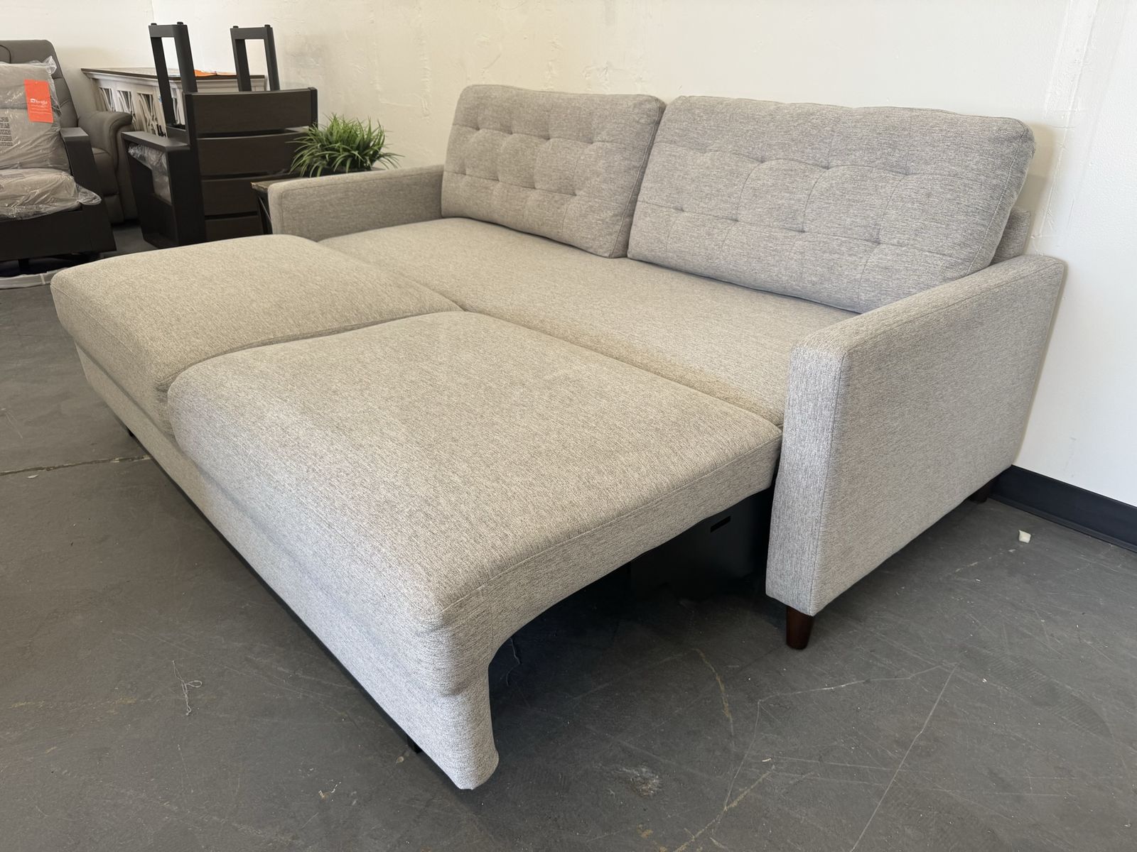 Features: Sofa Extends for a Lounge Option Modern Silhouette with a Mid-Century Feel Tufted Back Cushions Add Style and Comfort Tapered Legs in a Warm Brown Finish Upholstered in a Soft, Neutral 100% Polyester Fabric