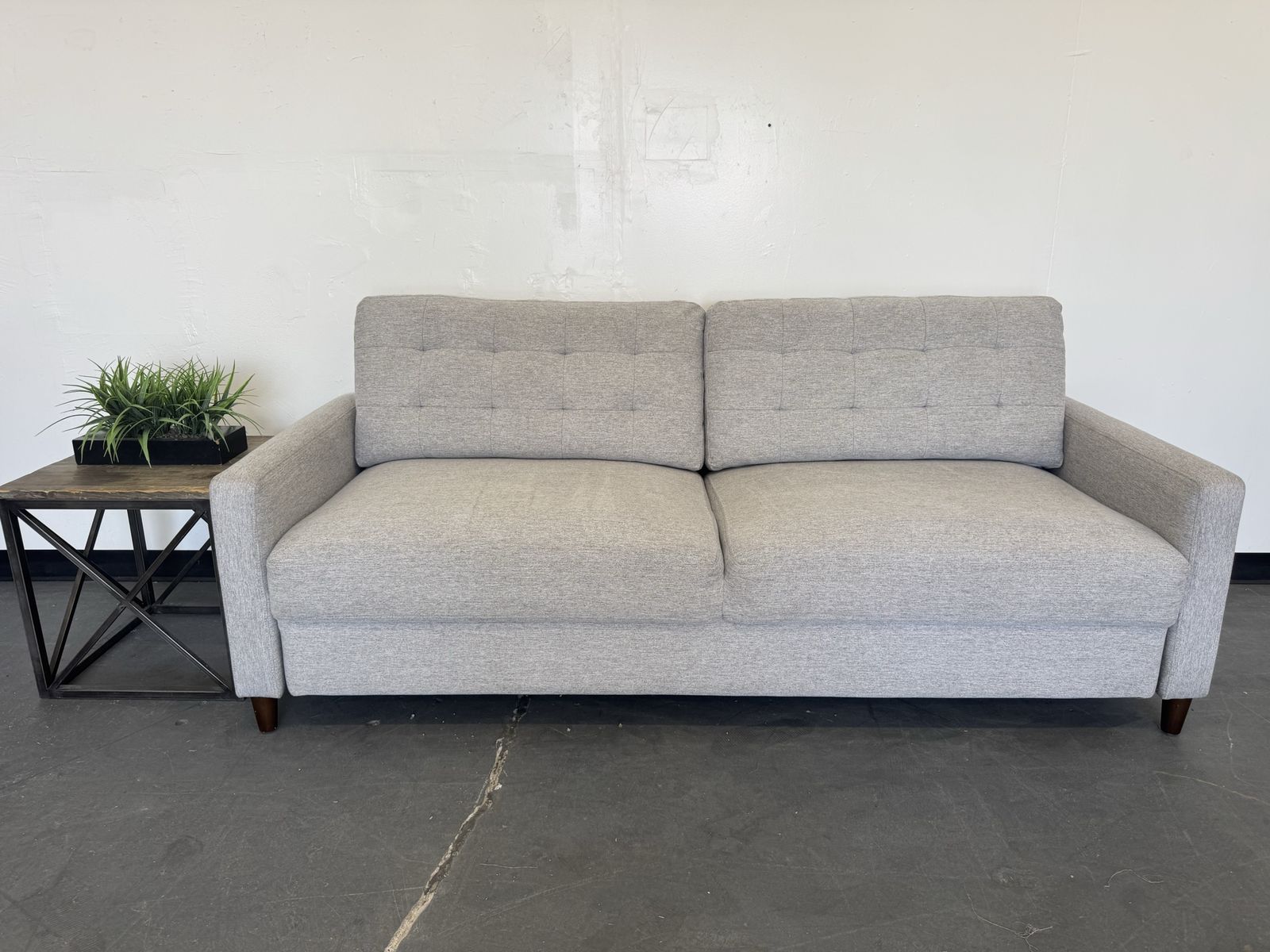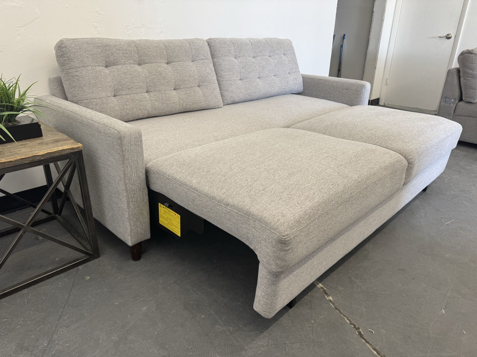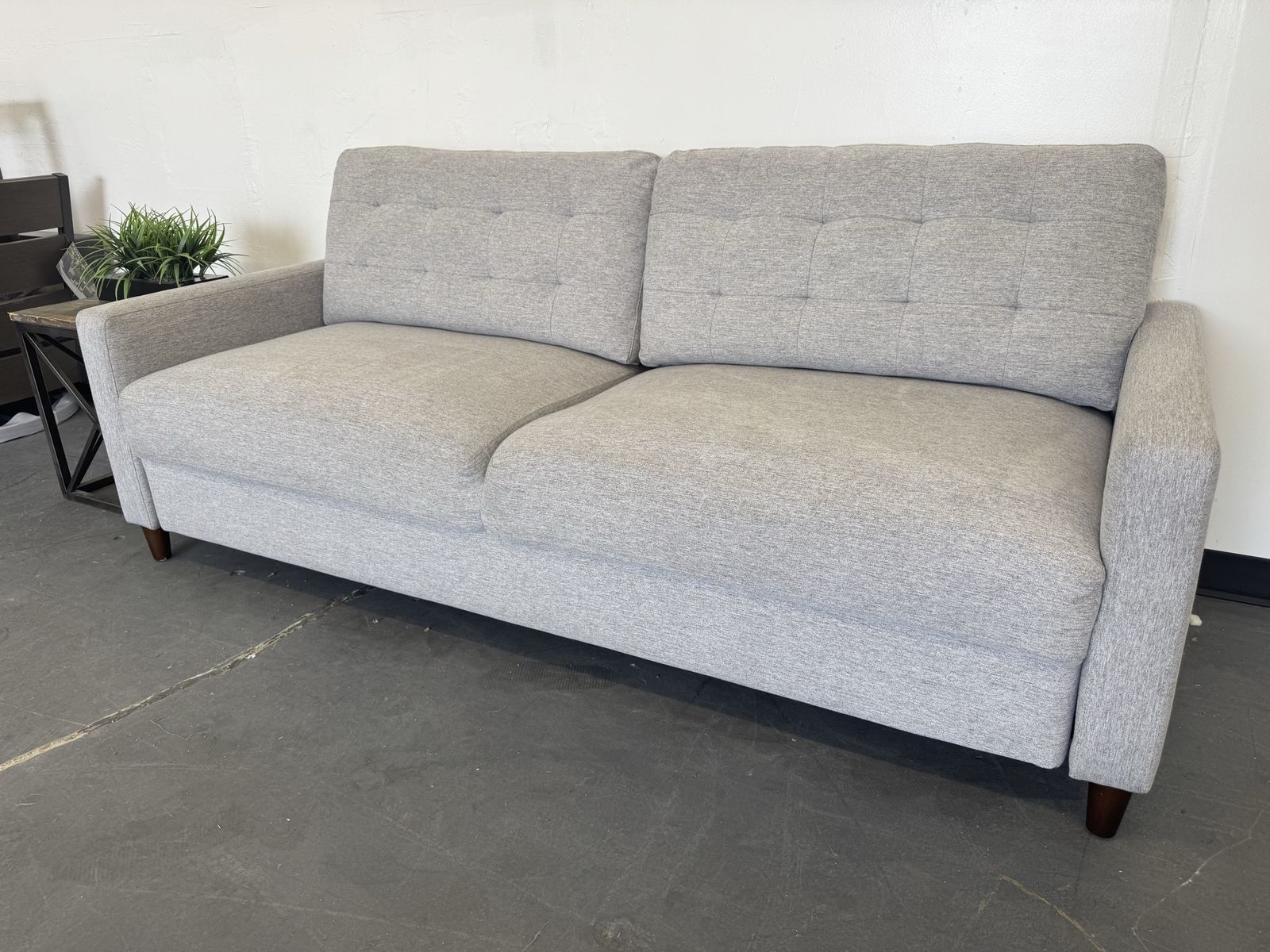 Features: Sofa Extends for a Lounge Option Modern Silhouette with a Mid-Century Feel Tufted Back Cushions Add Style and Comfort Tapered Legs in a Warm Brown Finish Upholstered in a Soft, Neutral 100% Polyester Fabric