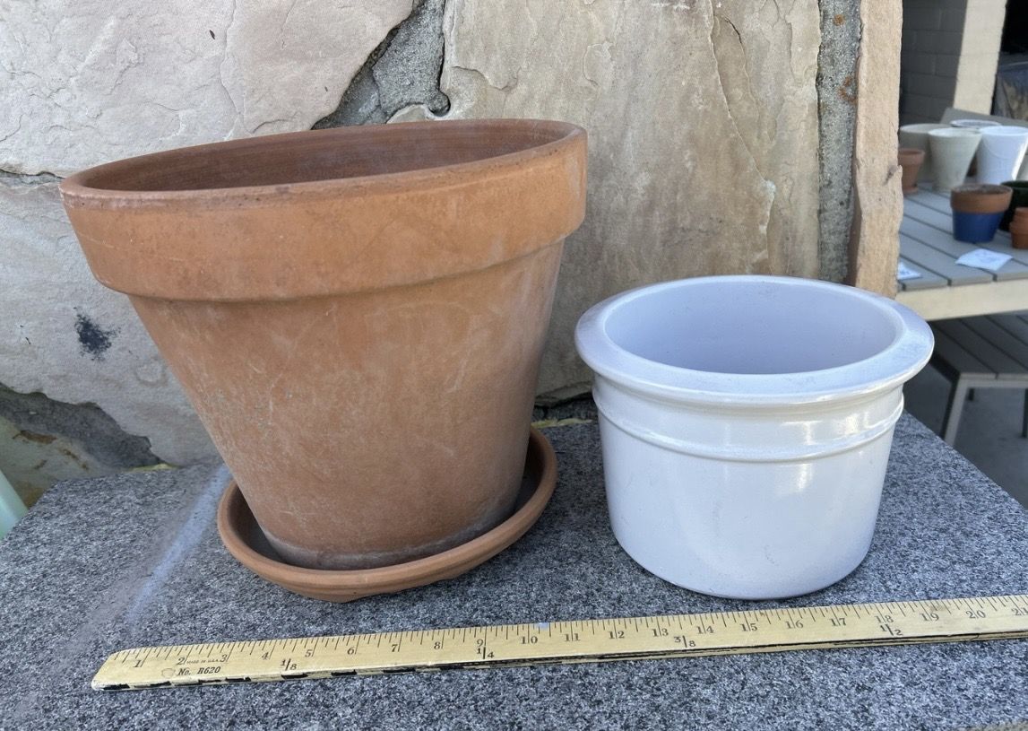 Fifth Pic. The white crock in the back is a 6" x 9" /Terra Cotta Large 11 t x 12.5