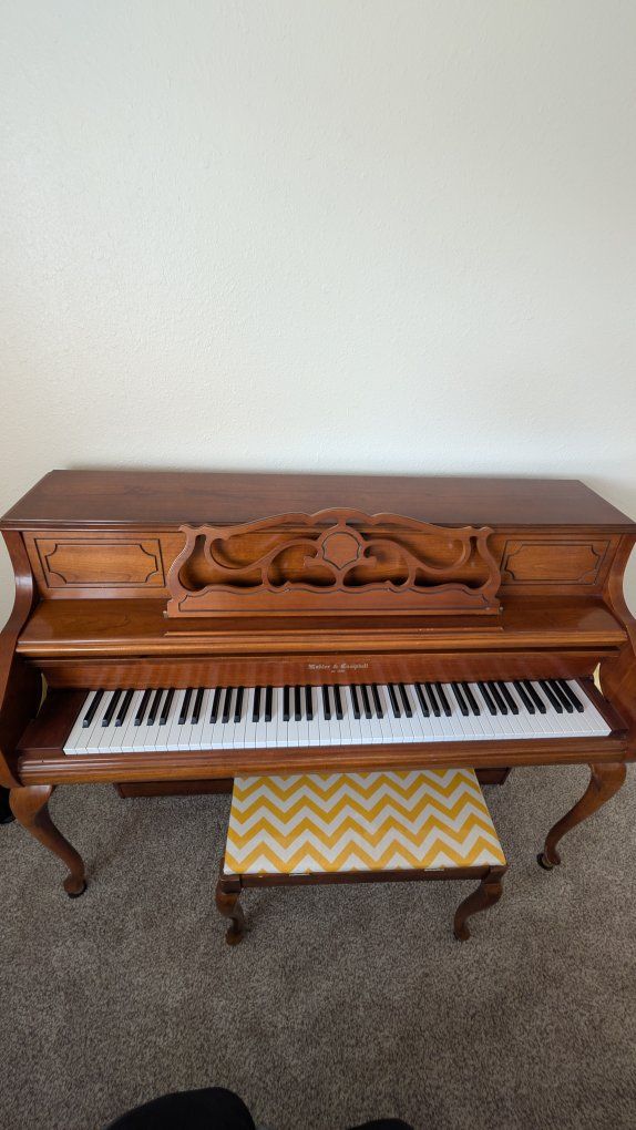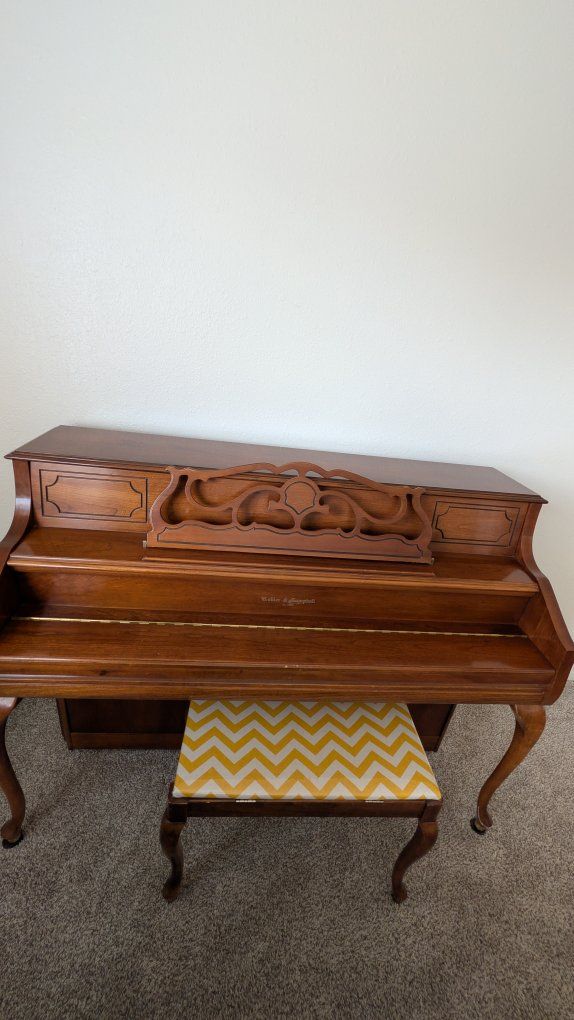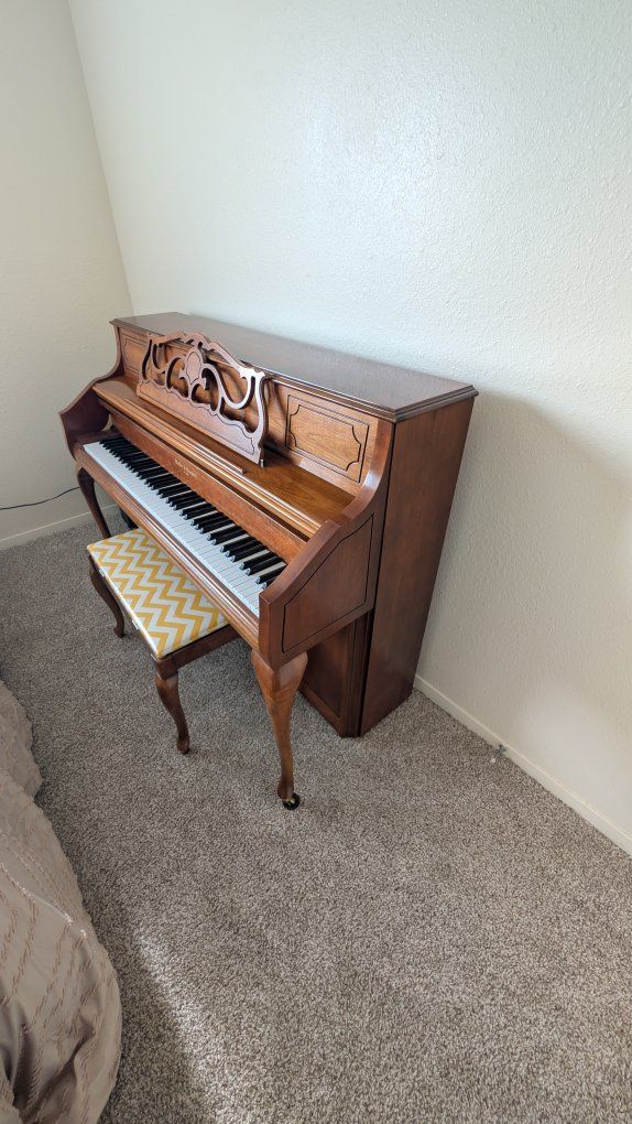 Features: Condition: Beautiful cherry/walnut satin finish with French Provincial legs. The cabinet is in excellent shape with very minimal wear. Internal: The hammers and strings are clean and in great working order (see photos). It has a lovely, bright tone. Size: Console height—perfect for a home or apartment without taking up too much space. Included: Matching padded bench with a modern chevron cover.