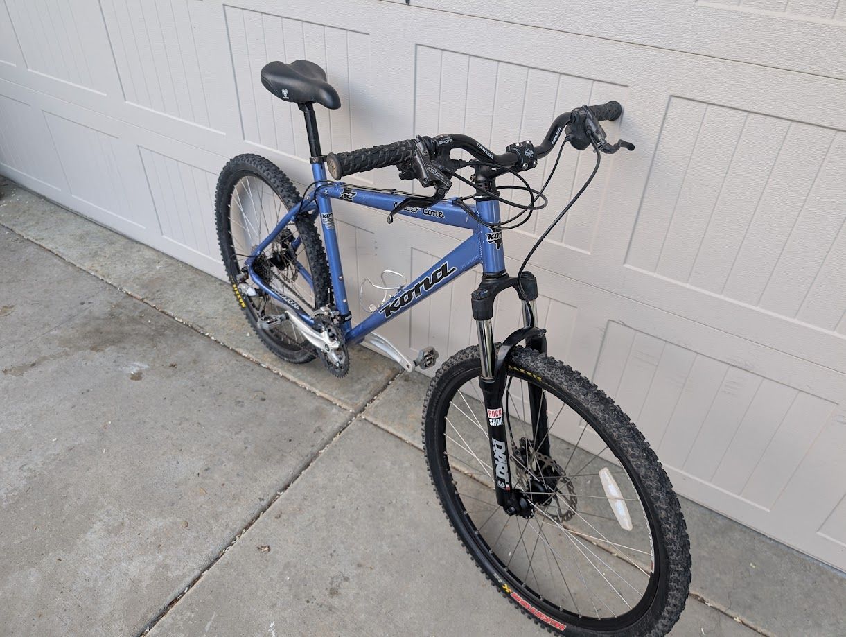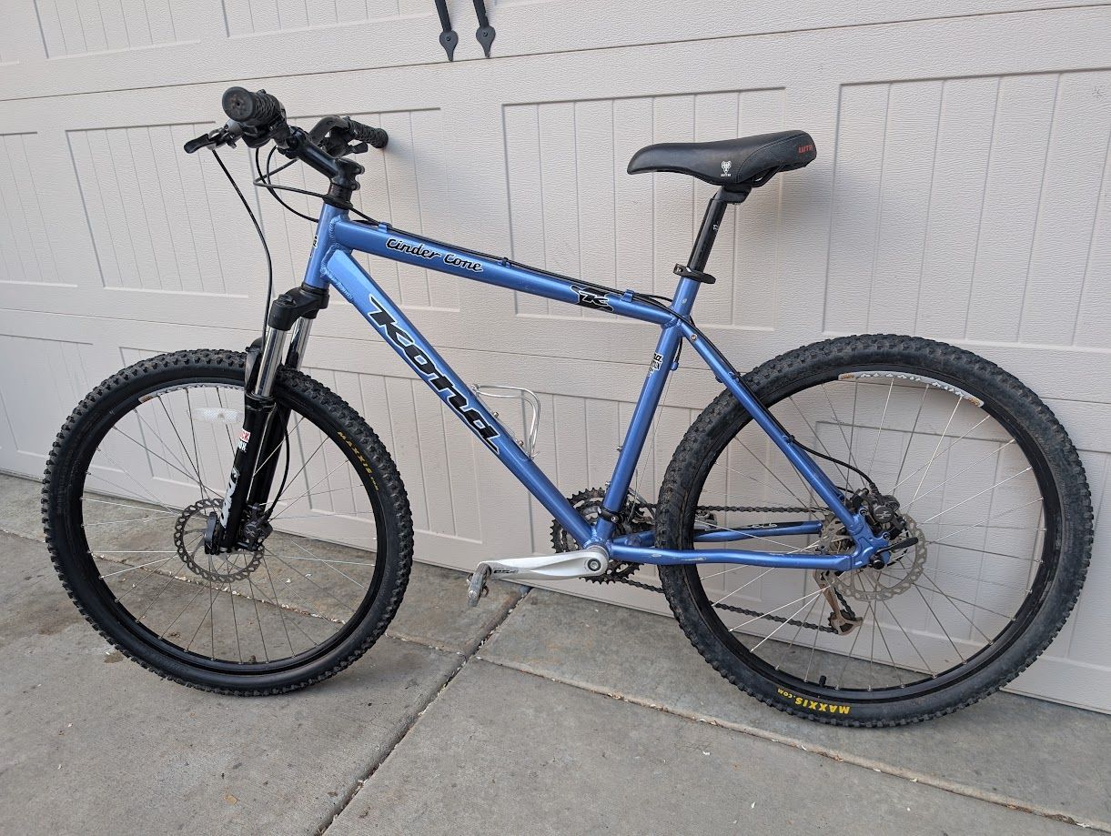 VenmoHere is a Kona Cinder Cone. Aluminium frame, Rock Shox fork, hydraulic disc brakes, Shimano 27 speeds and clipless pedals. Frame size is L (19"), fits people 5'9" to 6'1". Recently tuned up, everything works great.