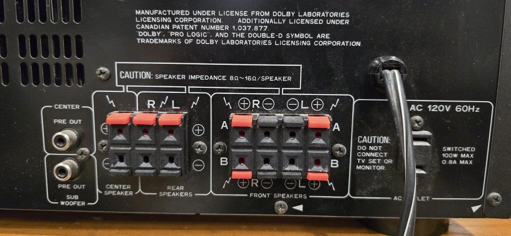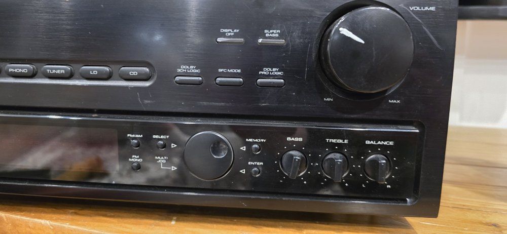 110 watts per channel. Dynamic power is rated at 150W at 8 ohms and can reach up to 300W at 2 ohms. Surround formats: Dolby Pro-Logic Surround, Dolby 3CH Logic, "Studio Effect" and "Simulated Surround" modes. Audio/Video Inputs: a dedicated phono input, and inputs for CD, LaserDisc, VCR/Tape 1, and Tape 2 Monitor. It has front-panel knobs for Bass, Treble, and Balance, plus a "Super Bass" button for extra low-end boost. Supports 5.1 channels with terminals for Main (A and B pairs), Center, and Rear speakers.