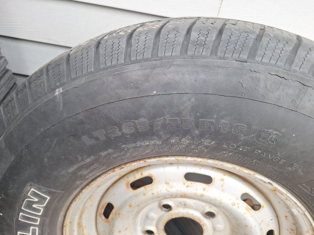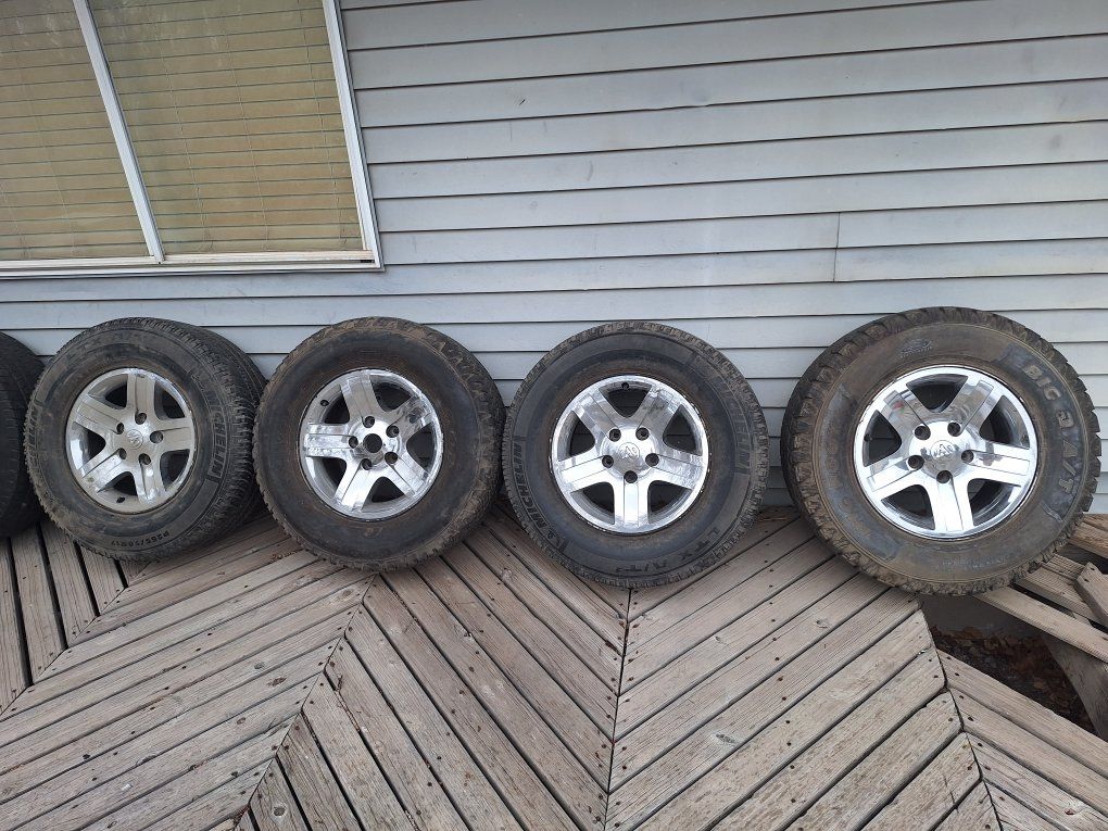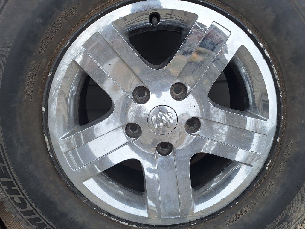Thank you looking at my ad. 4 Stock 17" Ram wheels w/tires off my 04 Ram 1500 and one 16" steel wheel w/spare. They've been sitting in my garage now for 3 years since my 01 Ram got stolen. 3 of the 5 tires have 50% tread, but all are old. the chrome are 17"x8 with 5x5.5 bolt pattern. The spare is 16x8 with 5x5.5