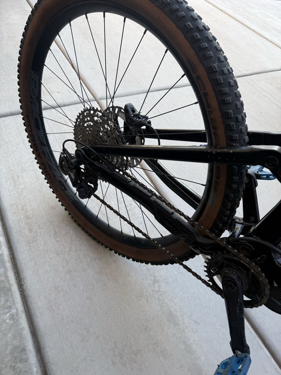 Frame: Orbea Rise Hydro 2022 140mm travel 29" Boost 12x148 Fork: Fox 36 Float Performance 150 Grip 3-Position QR15x110 Wheels: Race Face AR 30c Tubeless Tires: Schwalbe Nobby Nic Tan Sidewall Crankset: ethirteen Plus Aluminum Chainrings: ethirteen espec Direct Mount 32T Boost Derailleur: Shimano XT M8100 SGS Shadow Plus Brakes: Shimano M6100 Hydraulic Disc Dropper Post: ethirteen vario See Less
