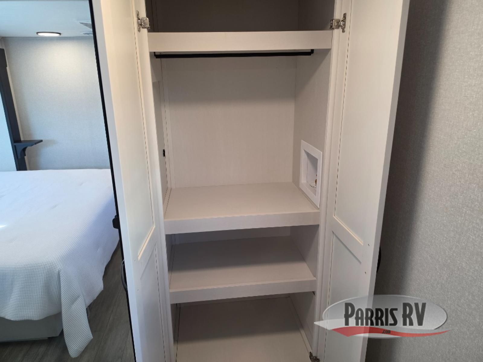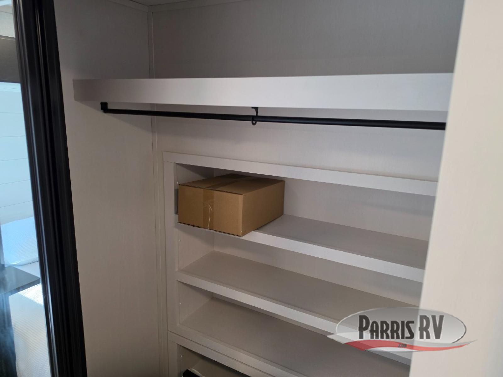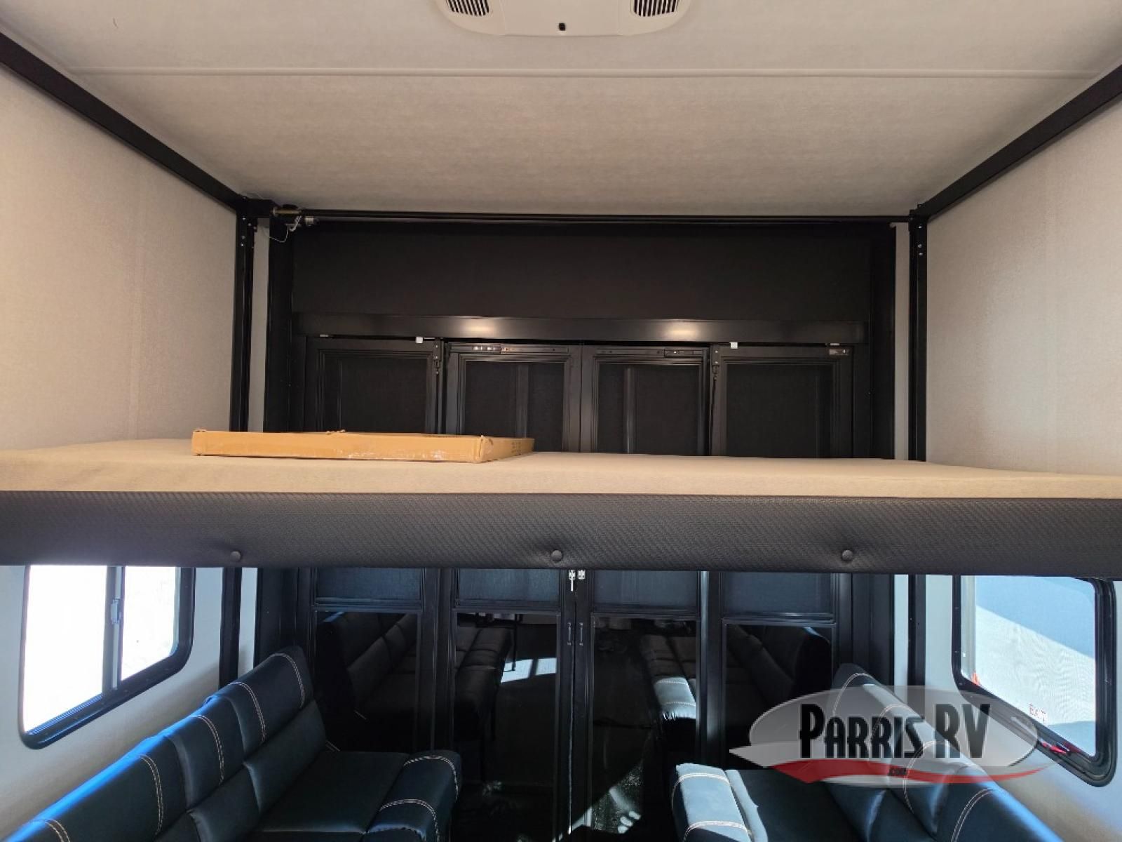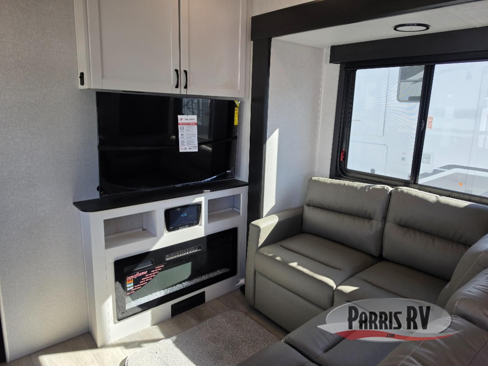 Get on the road with this toy hauler fifth wheel! The 14' garage is a playground for your toys, offering ample space for your ATV, motorcycle, or other gear. The loft above provides additional storage and an electric queen bed for a comfortable rest. The living room is a haven for relaxation, featuring an L-shaped sofa and a theater-style seat perfect for enjoying your favorite shows or movies on the TV. The kitchen is a culinary delight, equipped with a 12V refrigerator, microwave, overhead cabinets, and ample countertop space. The credenza with roll-out table is perfect for meal prep or serving, and the full bathroom provides a private space to freshen up, while the half bath option in the garage gives you more options. The cherry on top is that the front bedroom is a regal retreat, featuring a king bed, drawers, and a spacious walk-in closet.
