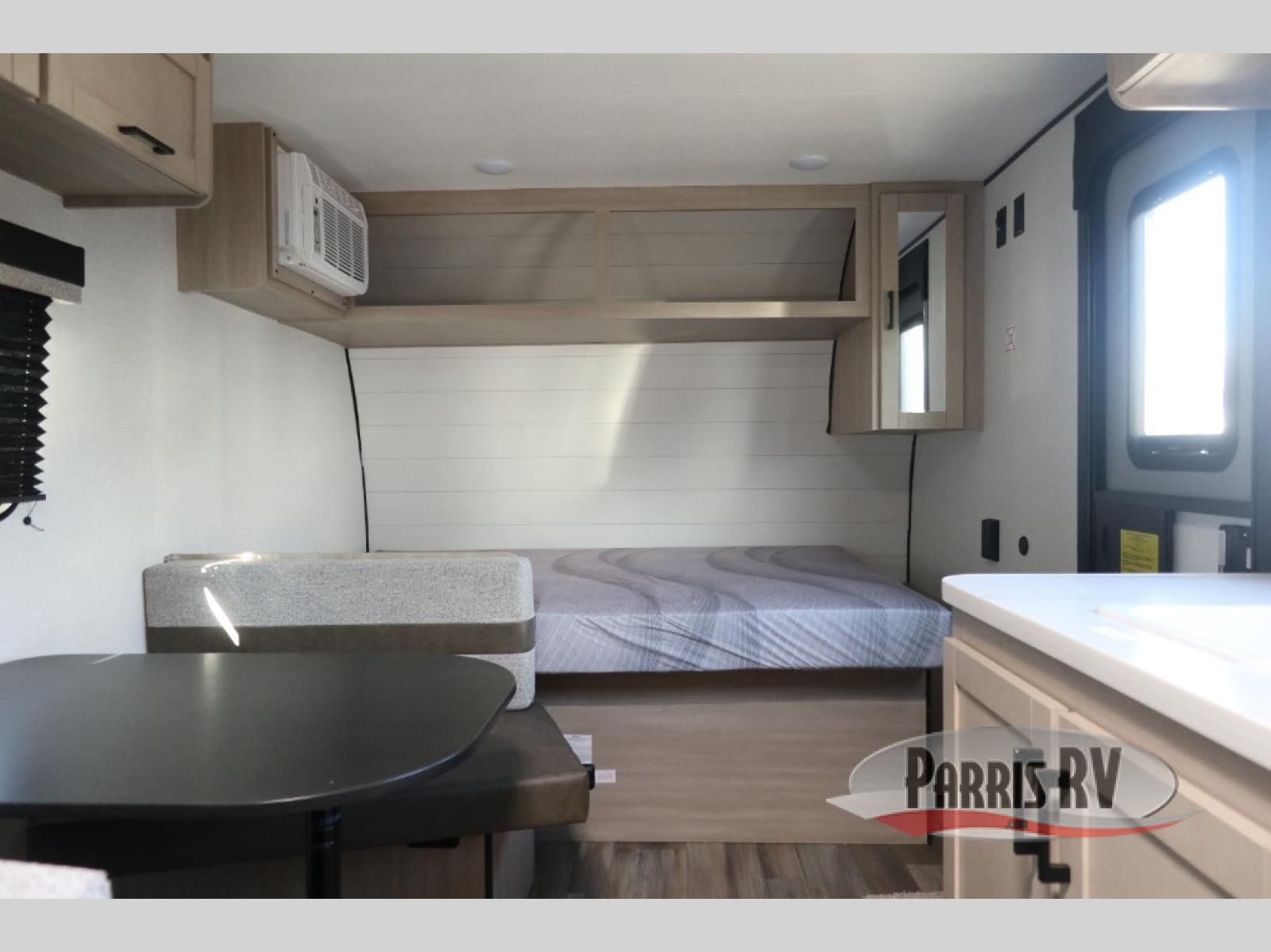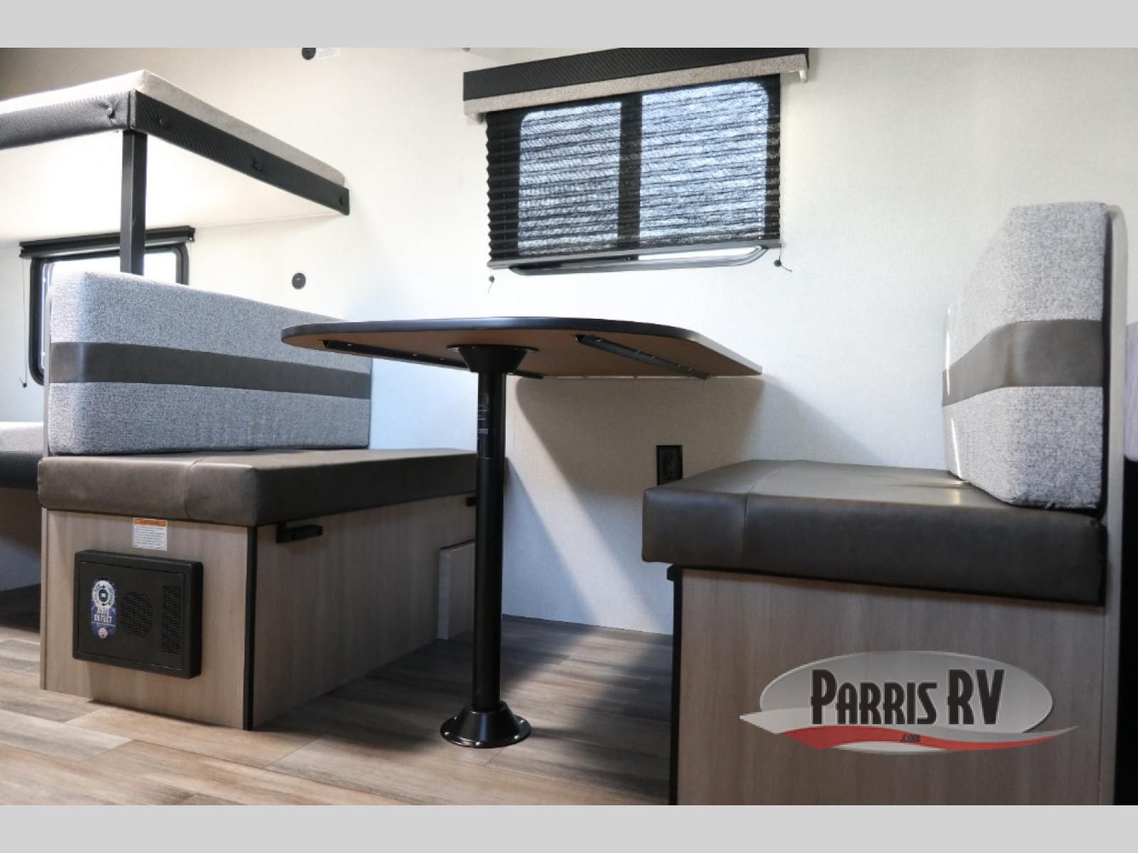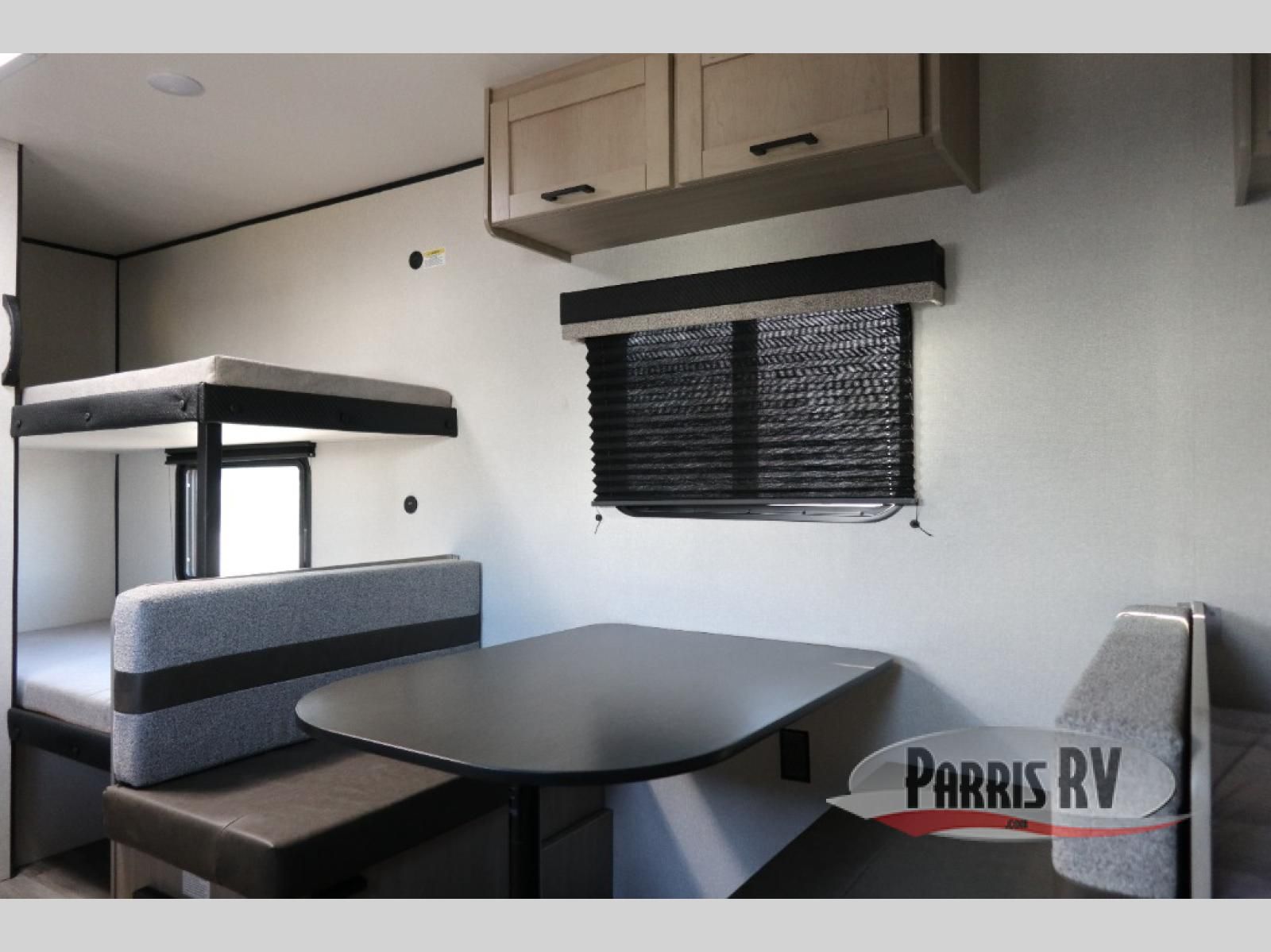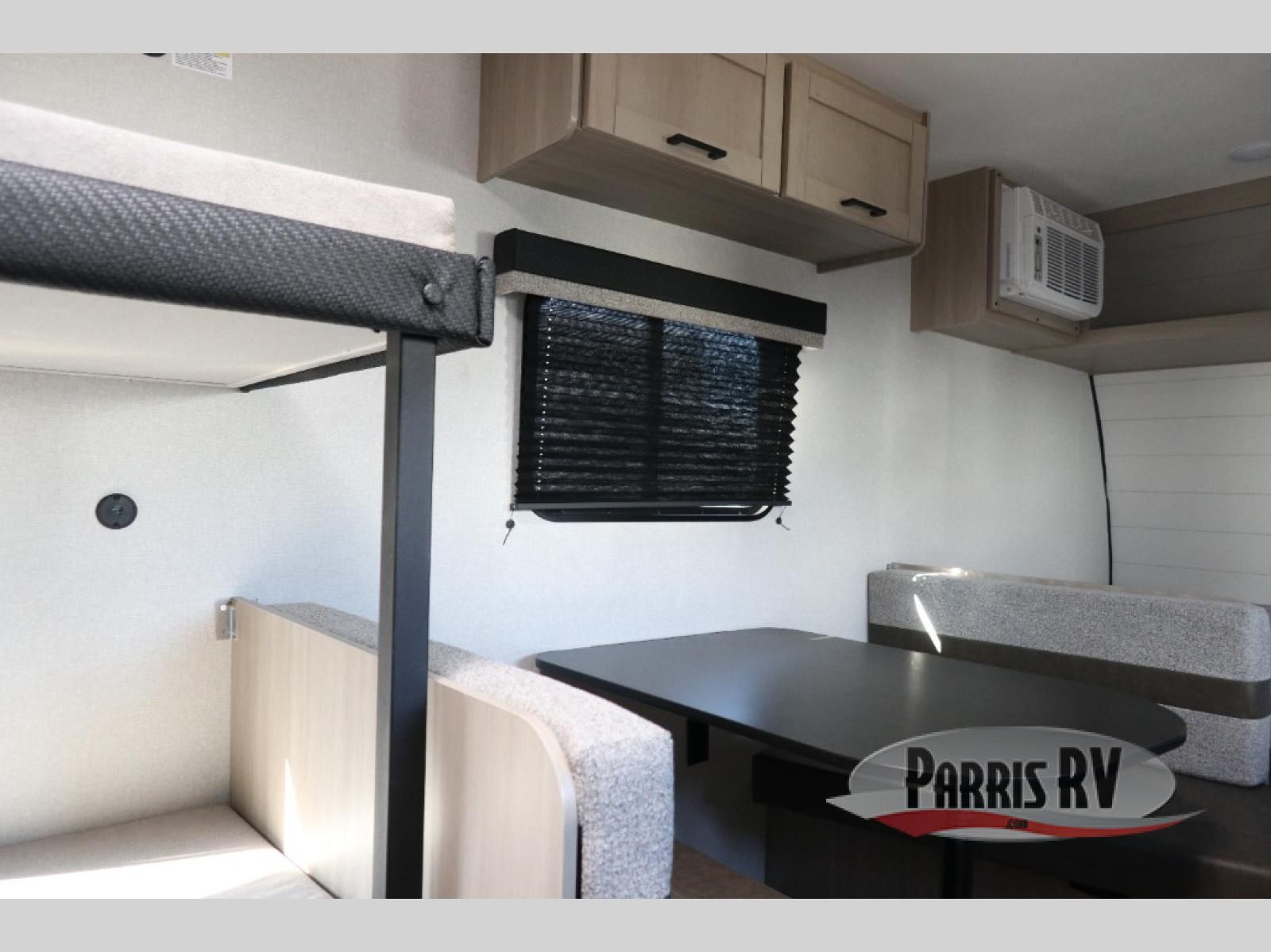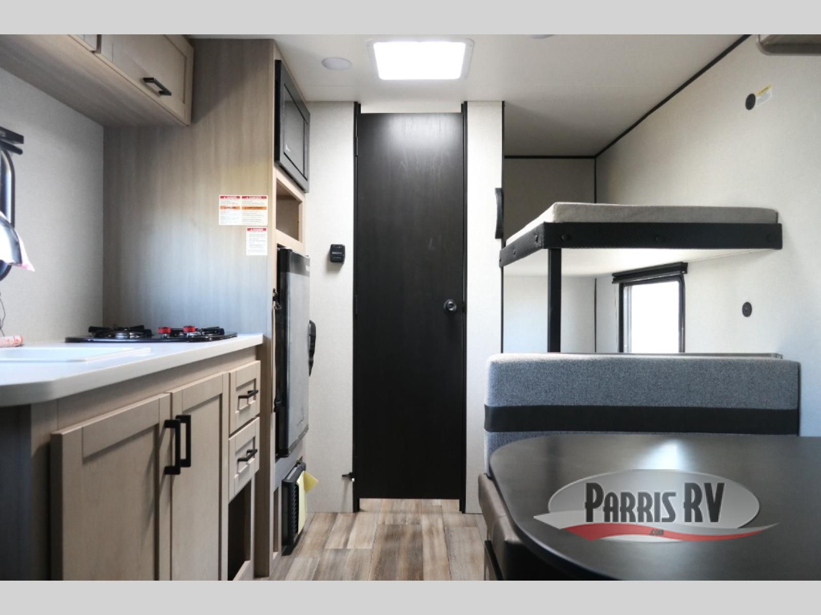 This easy to tow travel trailer features compact sleeping spaces thanks to the bunk beds in the rear corner, and the private bath is right next to the bunks for easy nighttime use! You'll have the front queen bed to yourselves, while another guest or two little ones convert the booth dinette to sleeping space. A two-burner cooktop and microwave oven will let you make meals each day, and there is a 12V refrigerator to keep your cold items fresh. Outside, you'll enjoy the 10' power awning for added shade, and there is exterior storage to keep fishing poles, hiking gear and more!