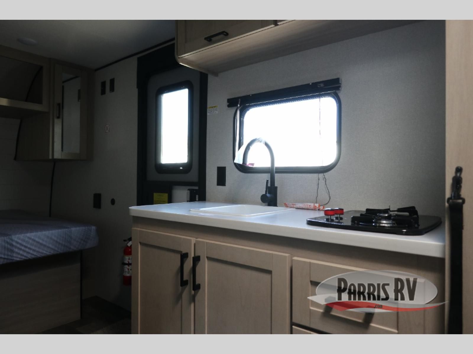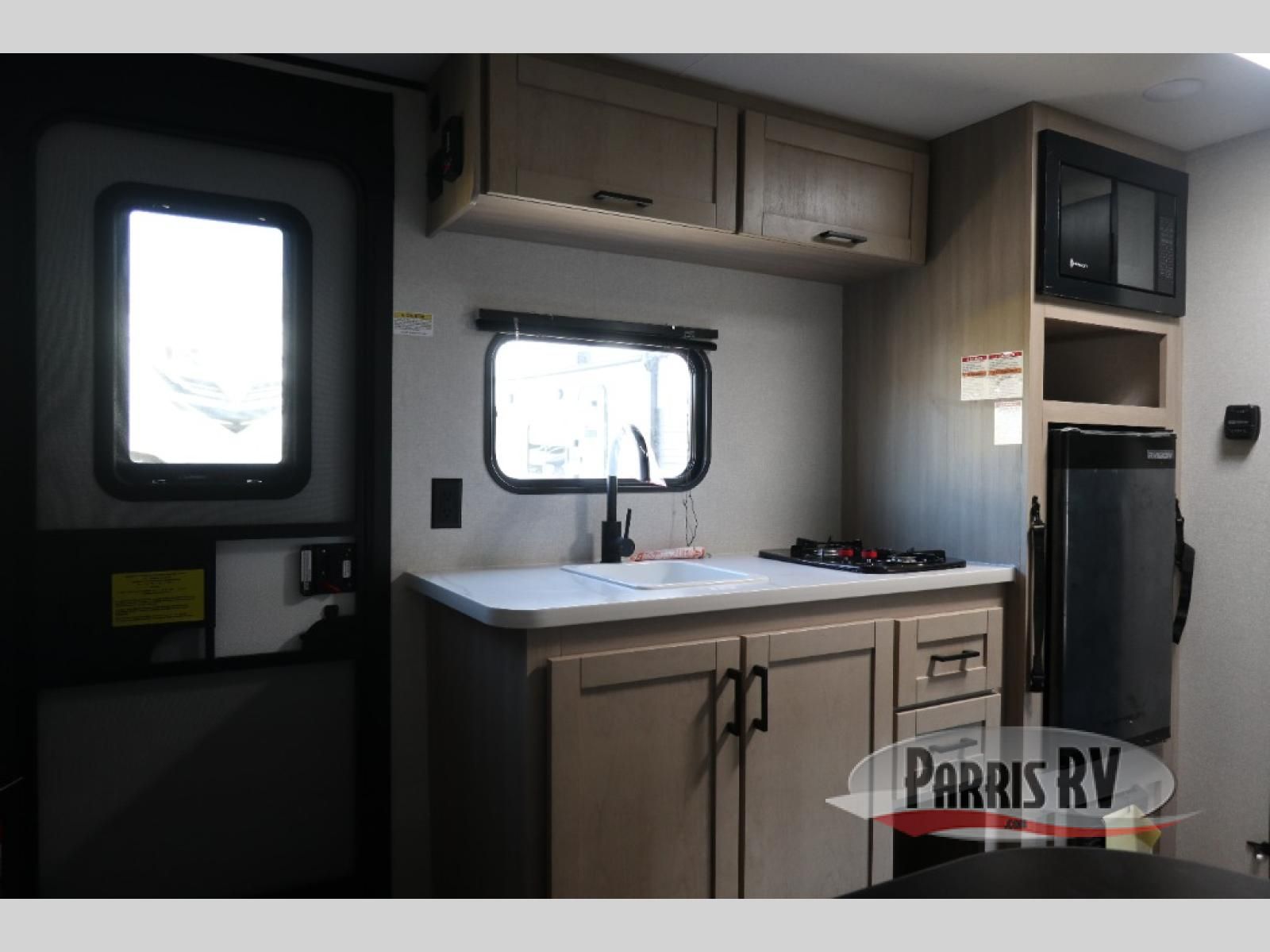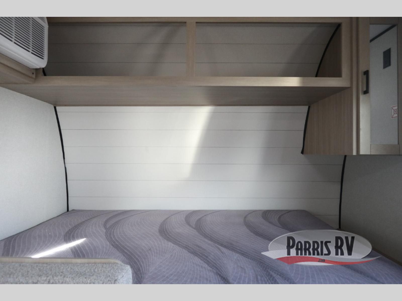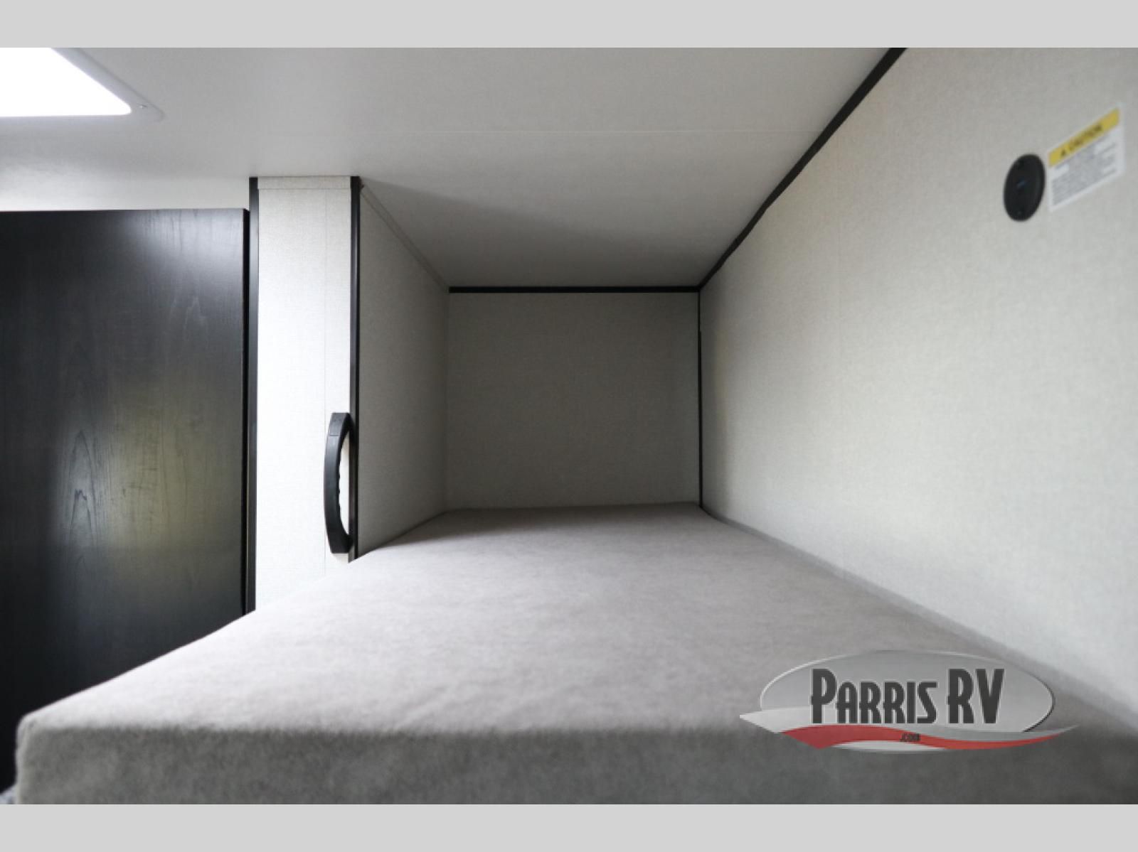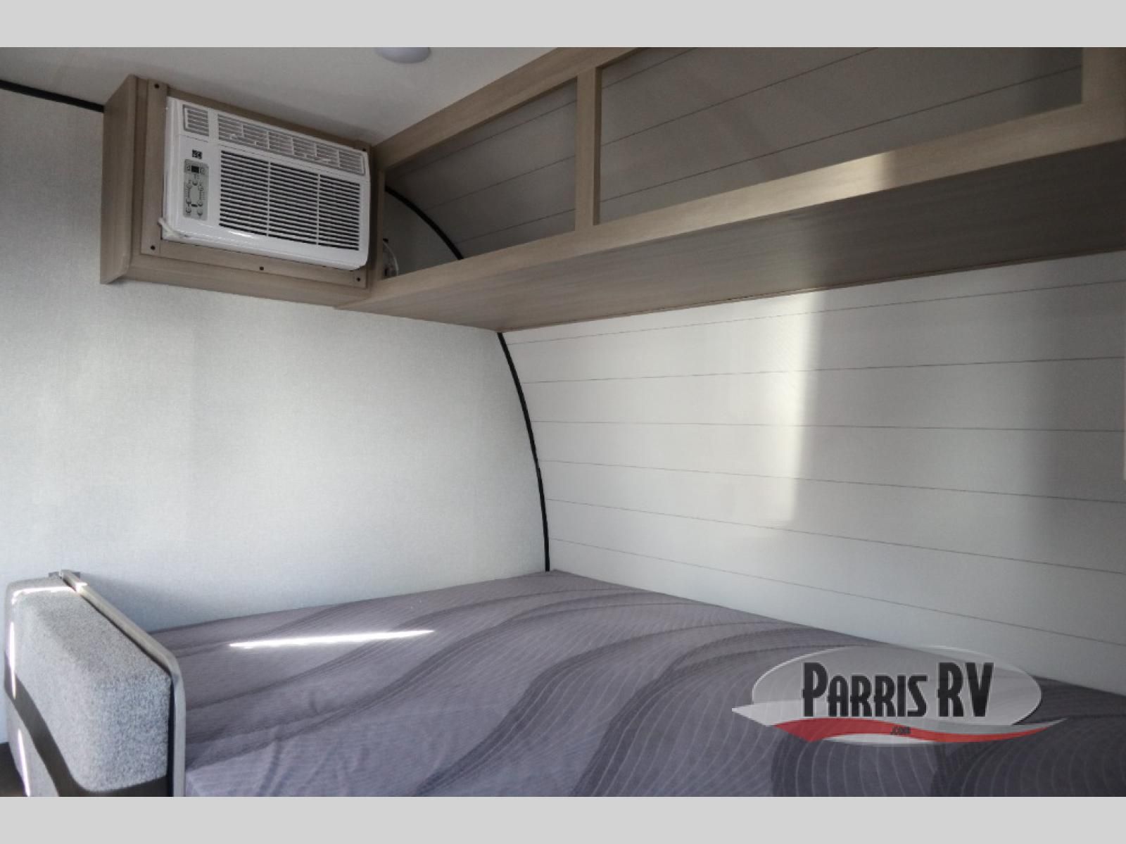 This easy to tow travel trailer features compact sleeping spaces thanks to the bunk beds in the rear corner, and the private bath is right next to the bunks for easy nighttime use! You'll have the front queen bed to yourselves, while another guest or two little ones convert the booth dinette to sleeping space. A two-burner cooktop and microwave oven will let you make meals each day, and there is a 12V refrigerator to keep your cold items fresh. Outside, you'll enjoy the 10' power awning for added shade, and there is exterior storage to keep fishing poles, hiking gear and more!