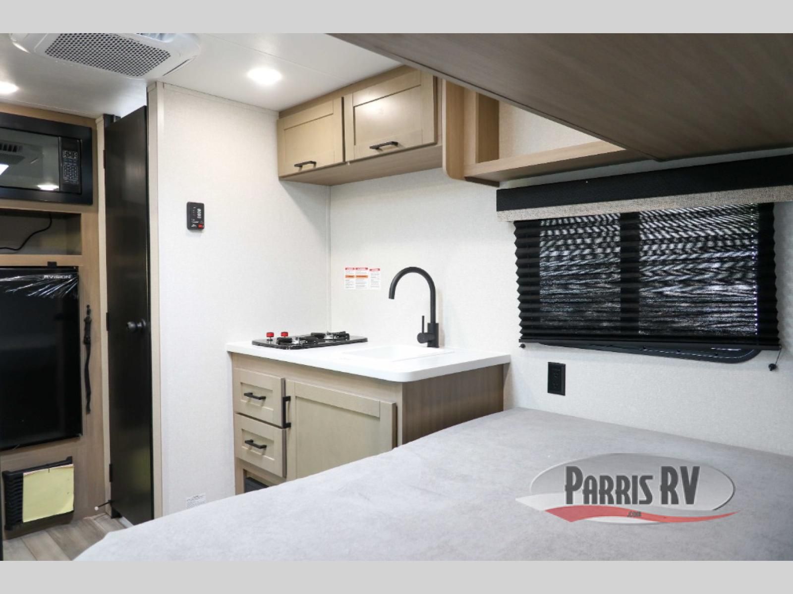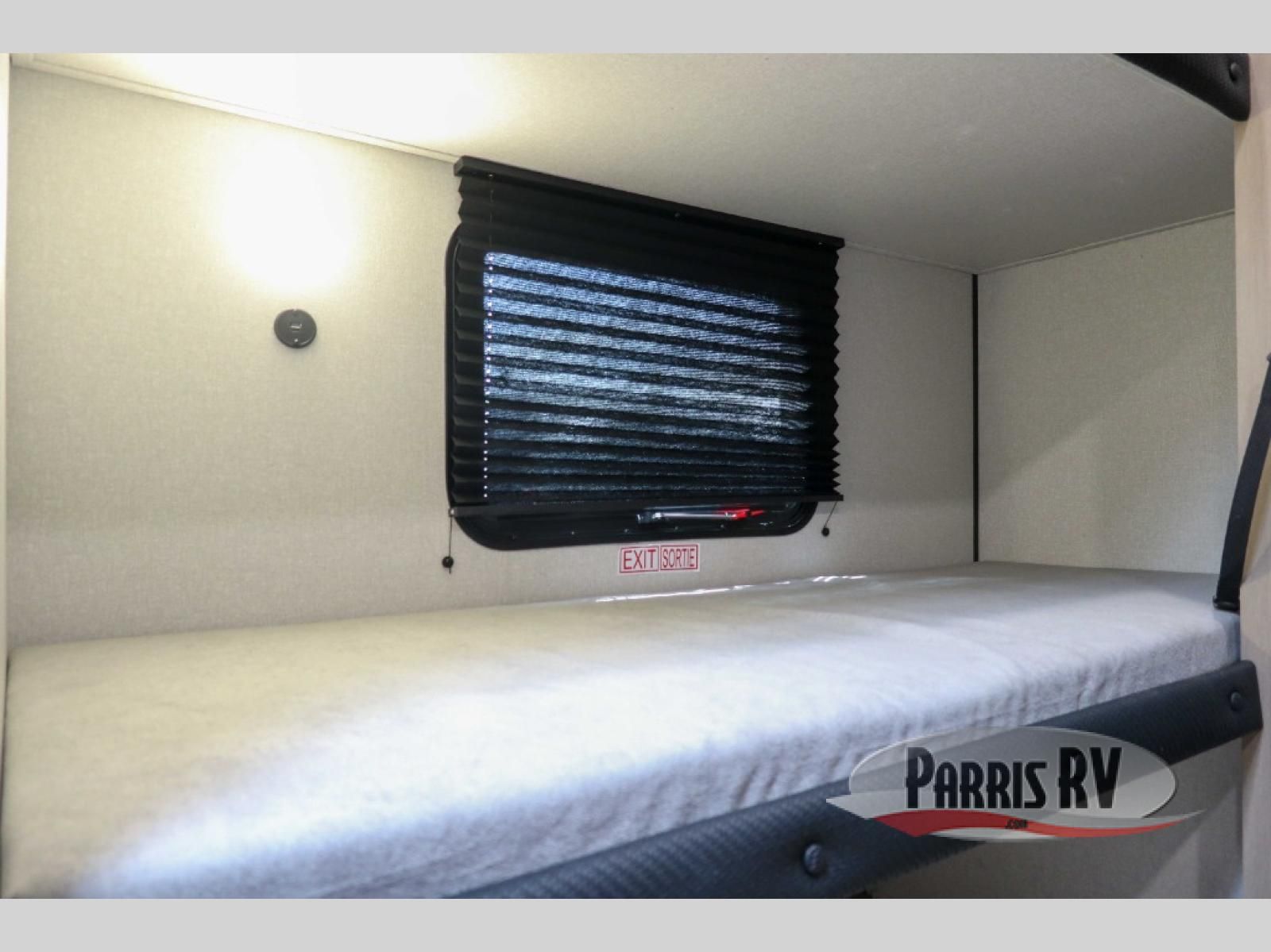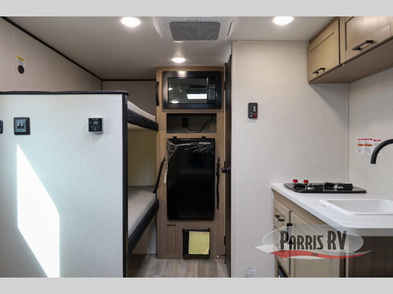 This lightweight travel trailer is easy to tow and easy to love! Once you arrive at your campsite and unload your things, you can make lunch on the two-burner cooktop or in the microwave oven, and there is a 12V refrigerator to keep cold drinks stocked. A private bath includes a shower and toilet, which will allow you to freshen up each day, and the bunk beds provide compact sleeping space for guests! You can take the front 54" x 74" full-size bed with a wardrobe/nightstand at the foot of the bed to keep your things tidy.