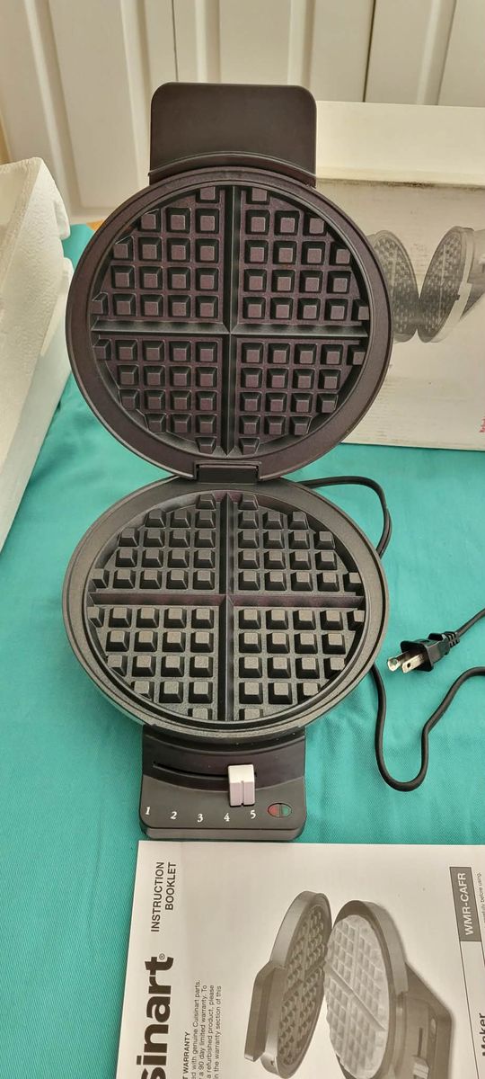 Awesome Cuisinart Classic Waffle Maker. This is a refurbished product with genuine Cuisinart parts. Bakes one large traditional-style waffle. Features 5-setting browning control and a regulating thermostat. Ready-to-bake and ready-to-eat indicator lights for perfect waffles every time. Nonstick baking plates for easy release. Brushed stainless steel housing looks super sleek. Moving! Must sell quickly! $30 OBO