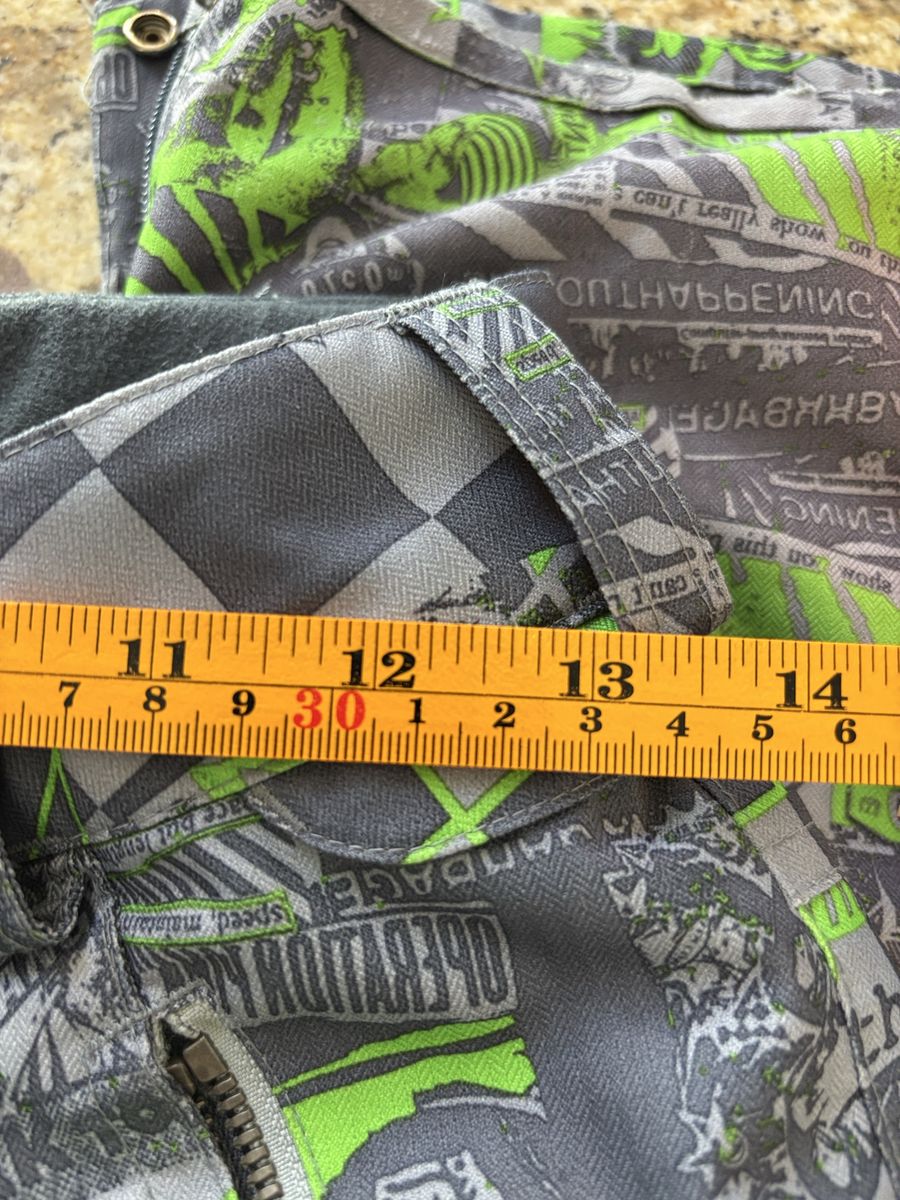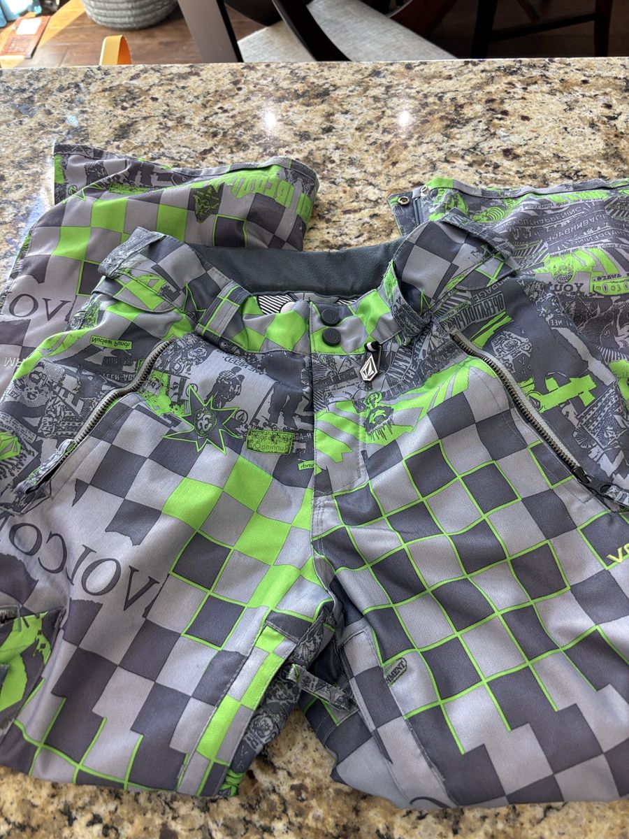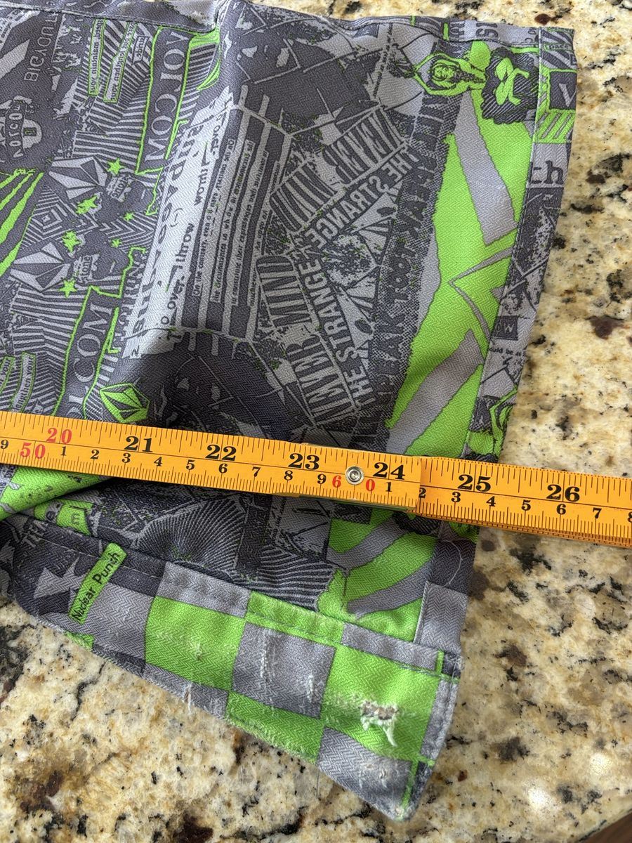 PayPalVolcom brand pants feature a vibrant neon green and grey checkered pattern, making them a bold statement for casual occasions. Made of cotton, these pants have a zip closure, flat front, and mid-rise fit. With a straight leg style and slash pockets, they are machine washable and perfect for summer and spring seasons. The pants also have the Volcom logo accent, adding a touch of personalization to the design. A size 27 waist fits comfortably, making them a popular choice for men looking to add a pop of color to their wardrobe.