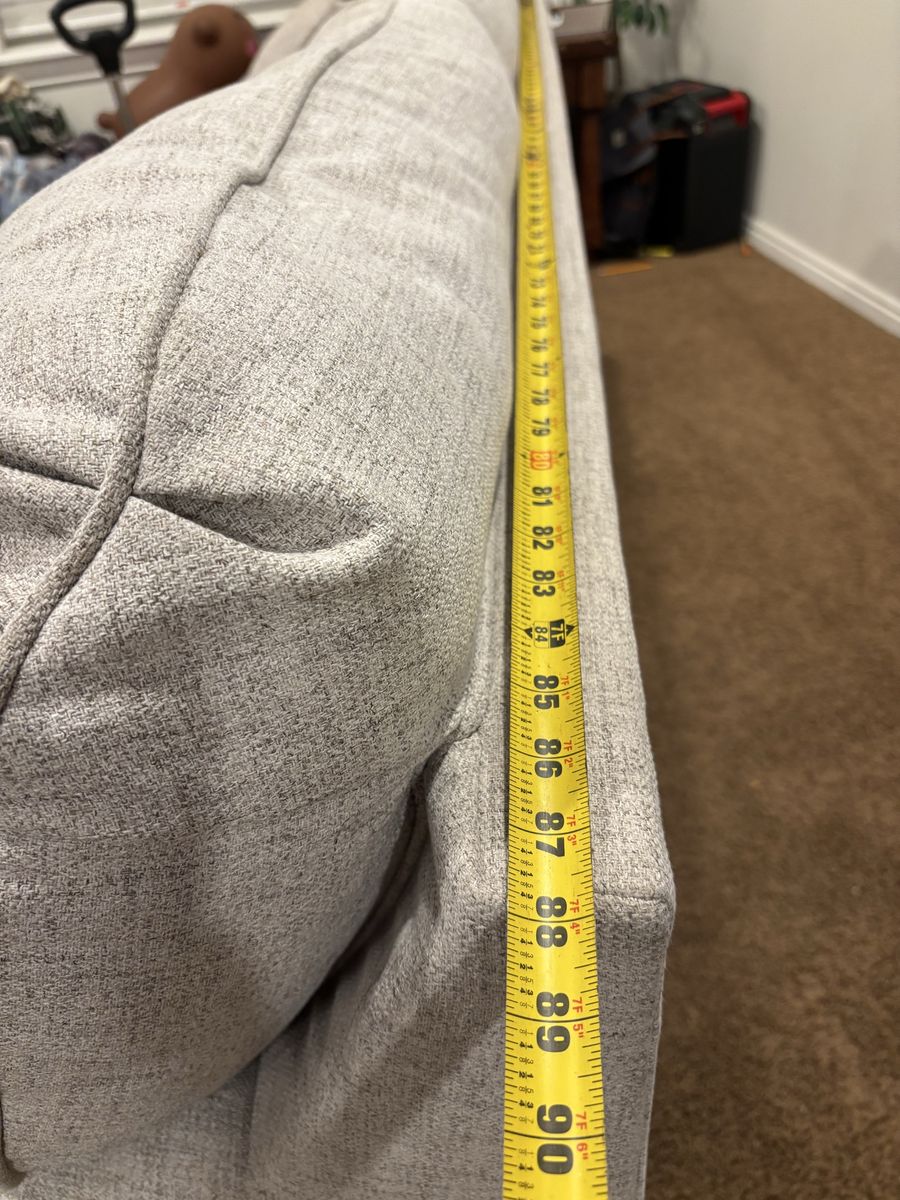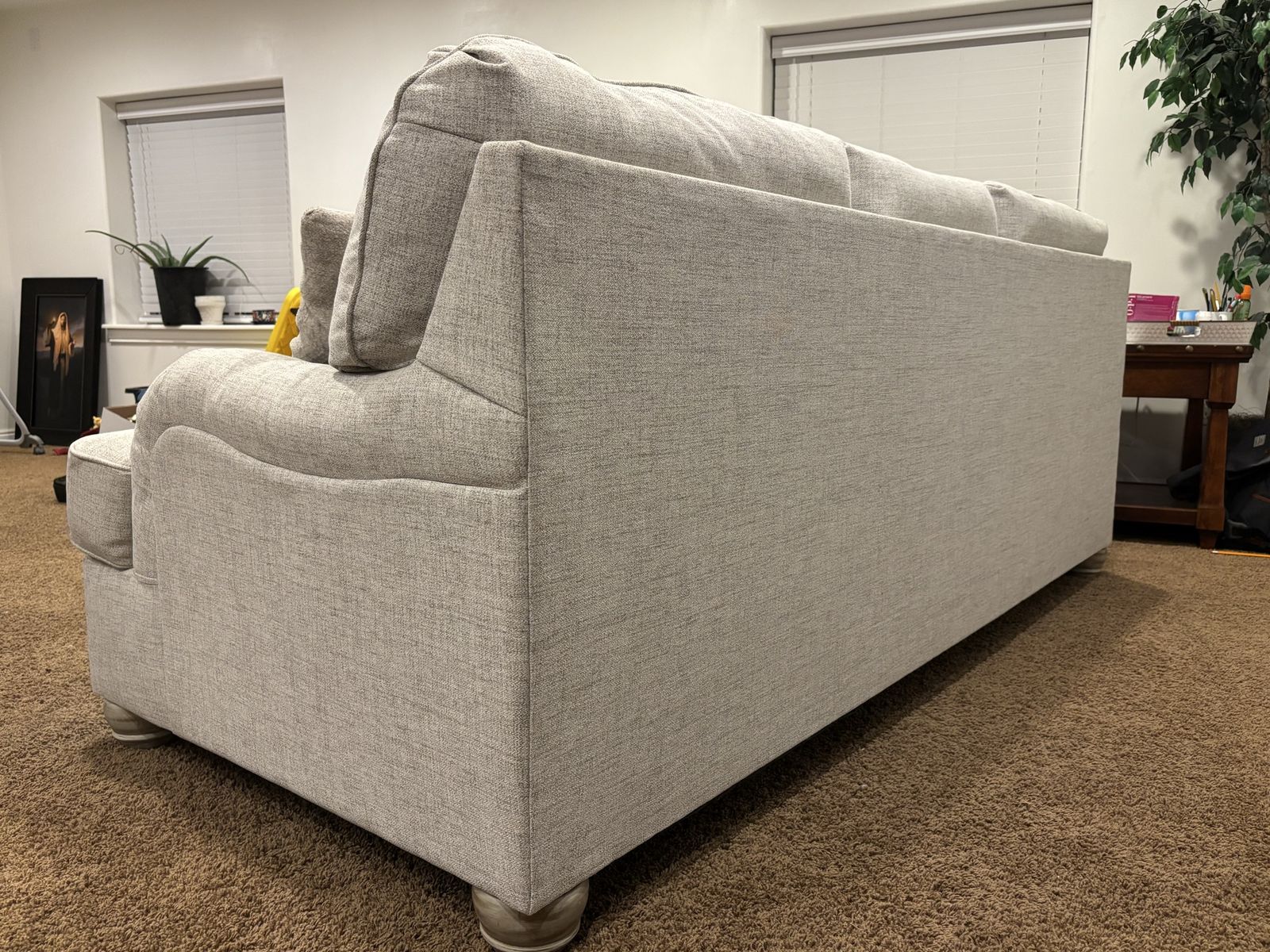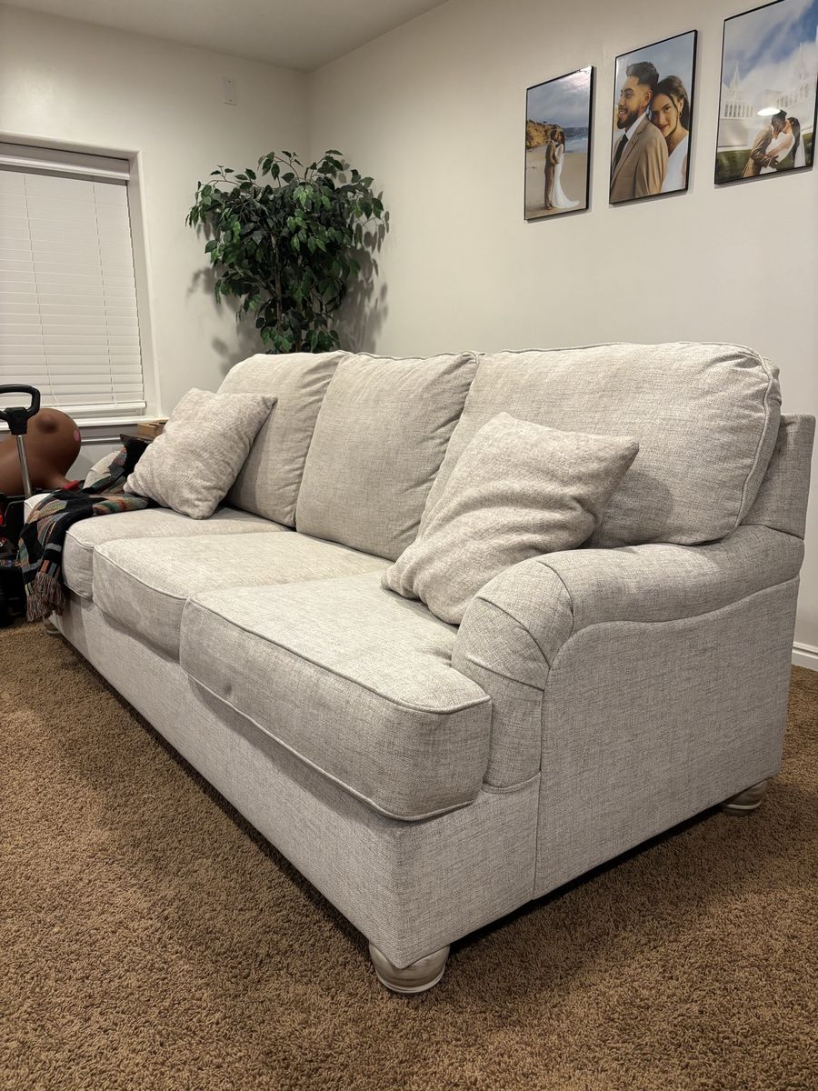 VenmoCool toned off white couch. In really good condition. No rips/tears. Bottom cushions come out and cases are washable. Price is negotiable and free delivery within utah county. Measurements are on the pictures. Pillows and throw blanket not included.