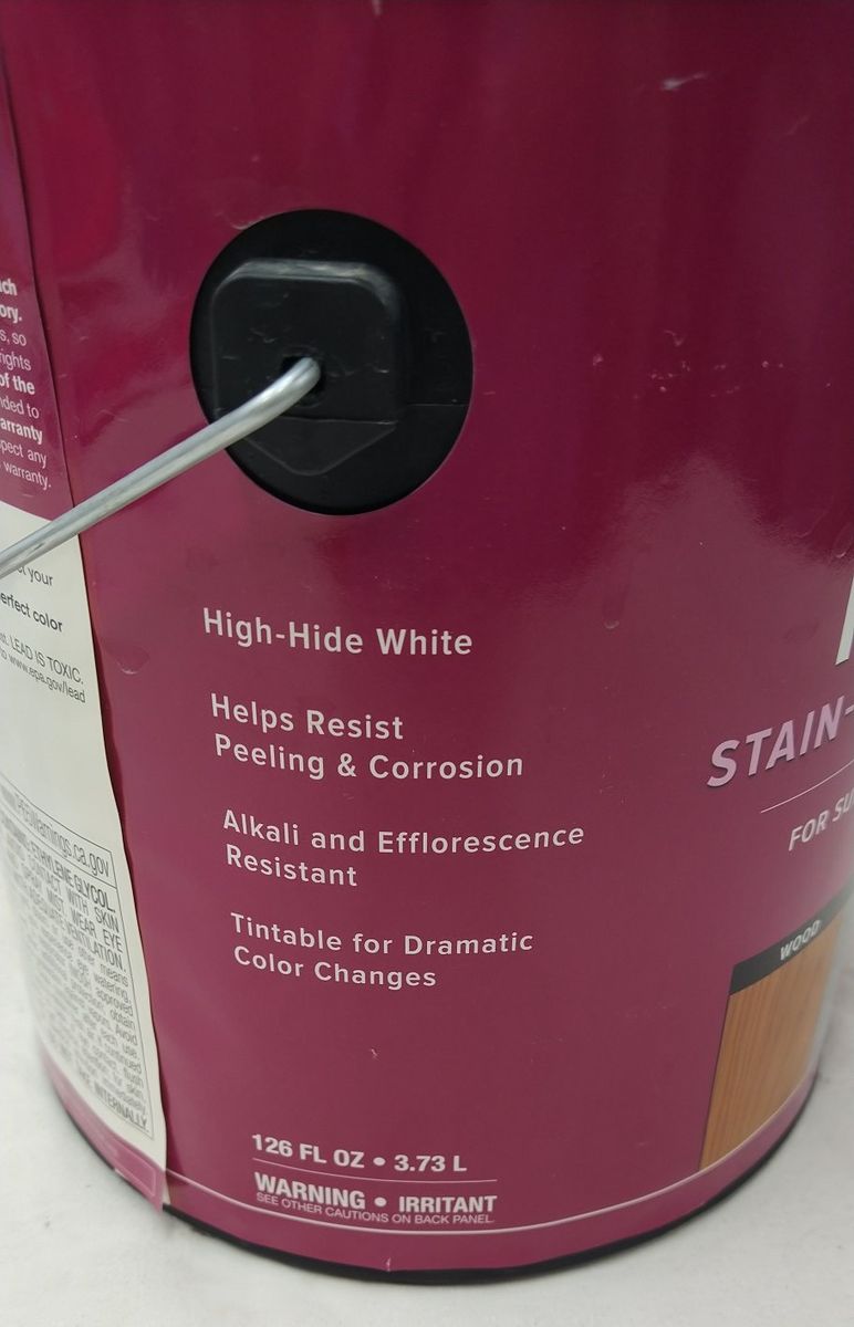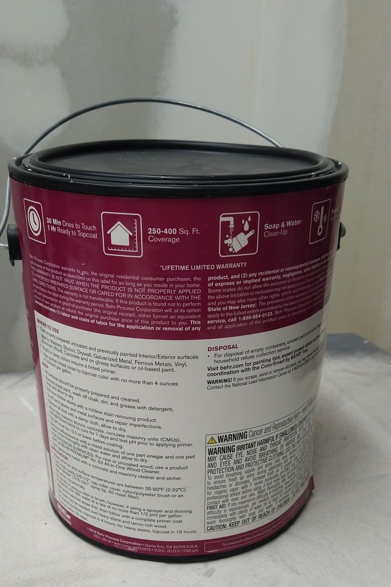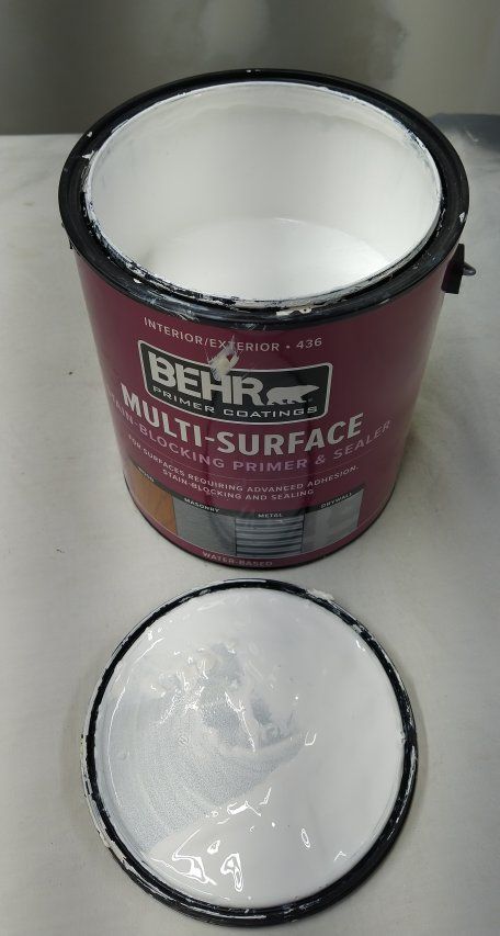More than 1/2 a gallon in can. Interior/ exterior white primer. We used it to prime a bedroom door and it didn't sand well. It sands like you are erasing something with a pencil eraser. It does paint on smooth and covers well. Just not what we needed for a fine finish.