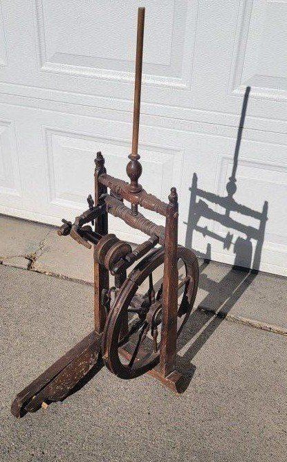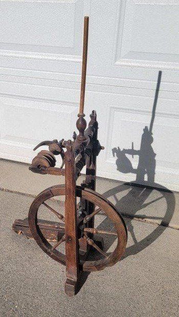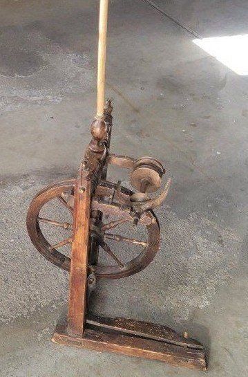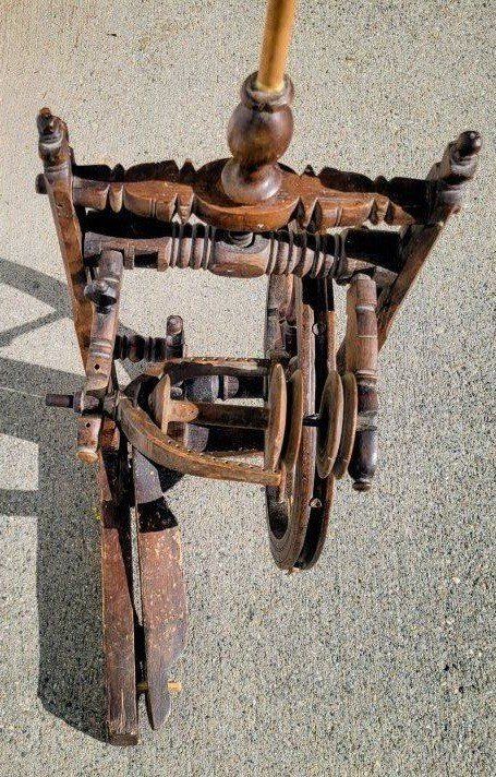 Primitive antique castle spinning wheel. The handmade wood work is amazing. The pedal works and the wheel spins. More pictures above