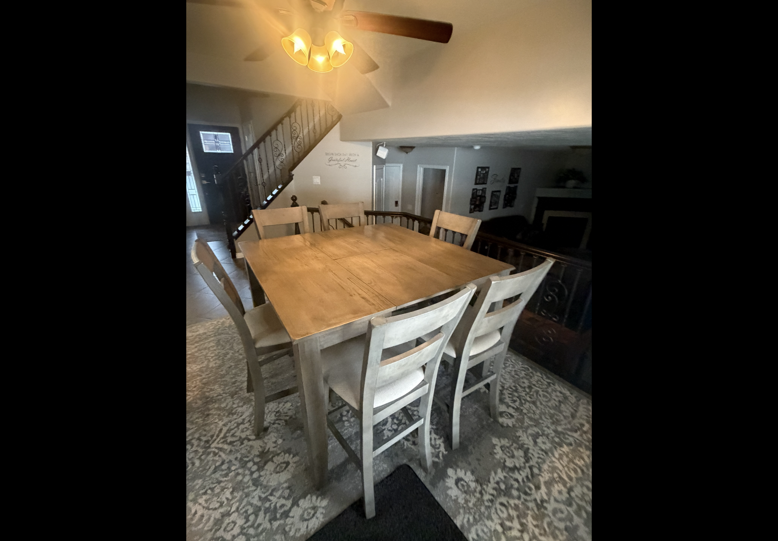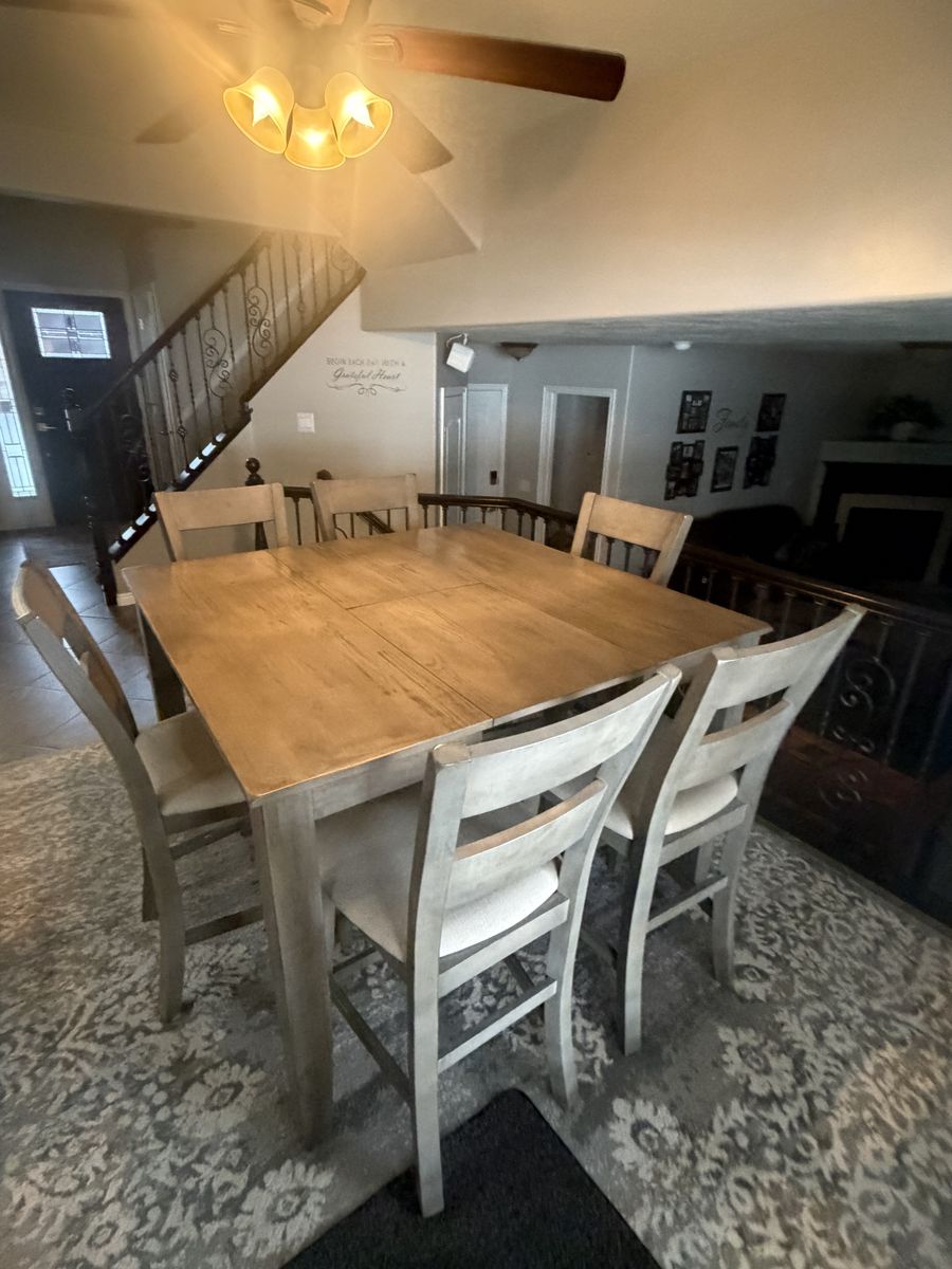 Nice tall dinning room set with 6 chairs 54x54 with the leaf. 54x 36 without