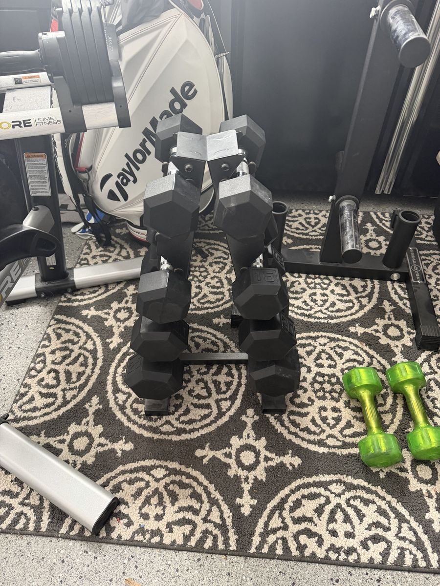 Perfect shape. I have non-matching 5lbs dumbbells that are included for free.