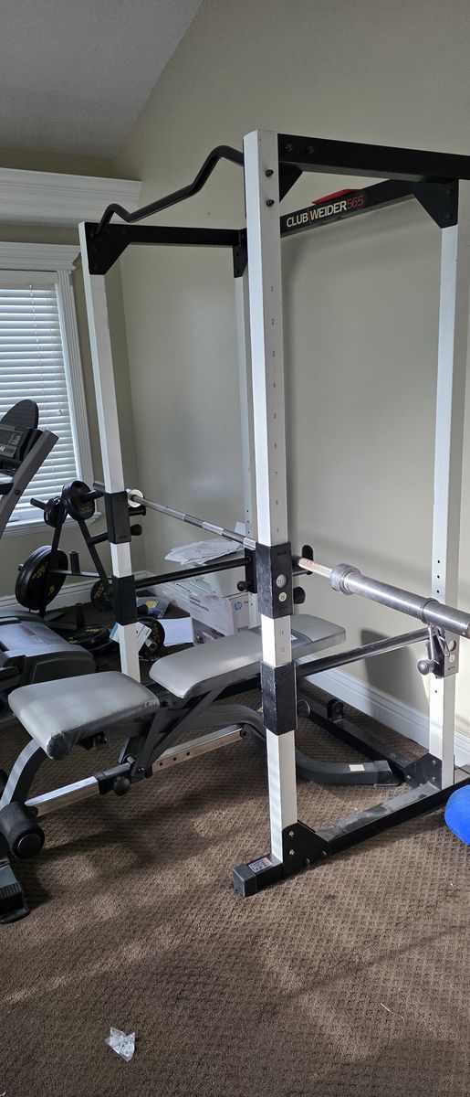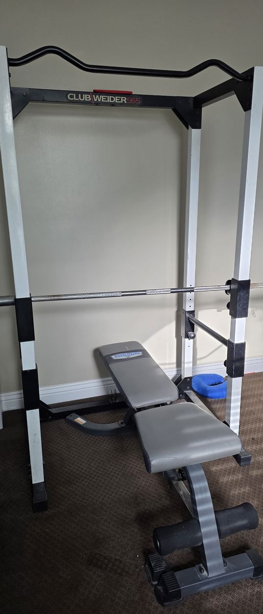 VenmoClub weider 565 rack, olympic barbell, curl bar, bench and golds gym plates