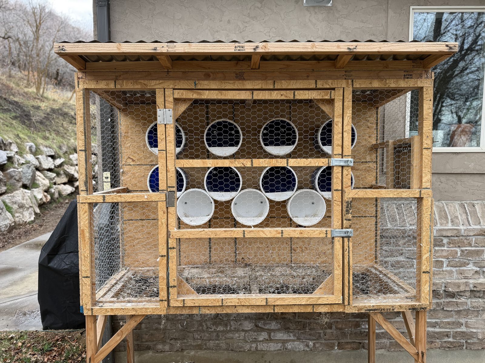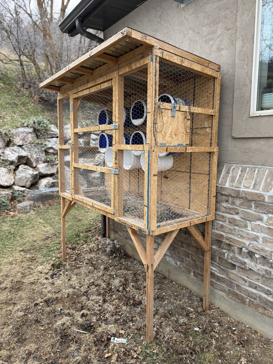 ApplePayHand-build pigeon coop. Designed for homing pigeons, and works well with the one-way gate. No issues with the birds returning to the coop. I designed it to go up against the house, but stay above the sprinklers. I also put a double layer of chicken wire along the bottom to protect against predators. I'll be happy to include the feeder and water font if you'd like. Thanks for viewing! Let me know if any questions. -J