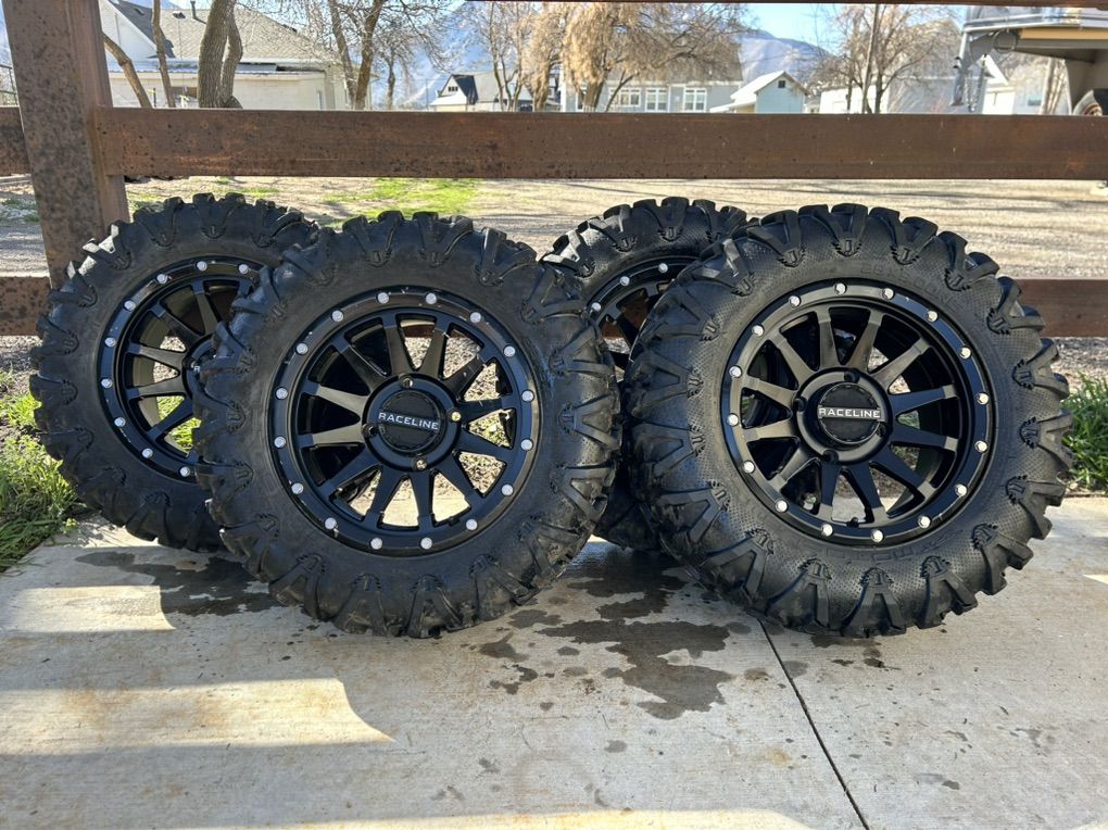 VenmoRaceline rims are 15 inches. The tires are Motoclaw 28x 9.00R15. One of the rims is missing the center cap. Took off Can-am defender, my husband wanted different rims. $500.00 obo