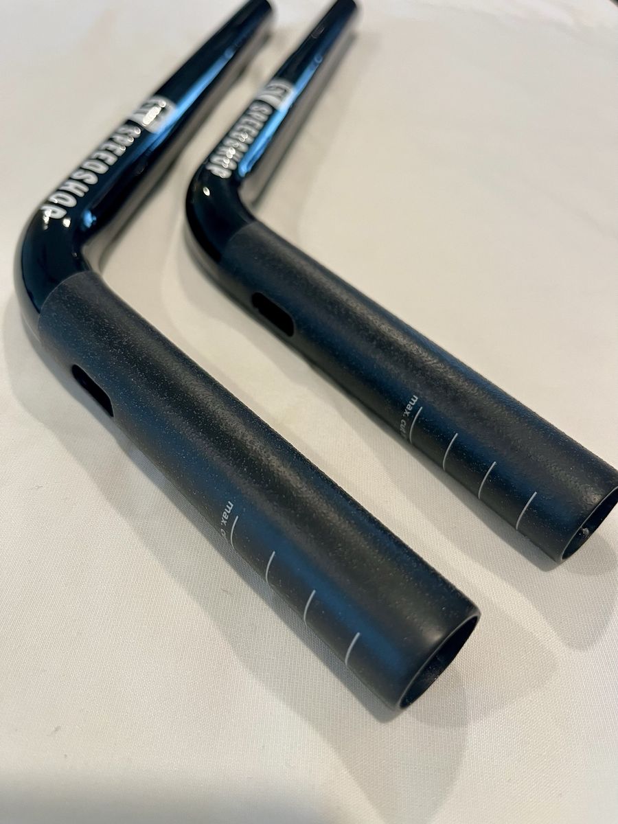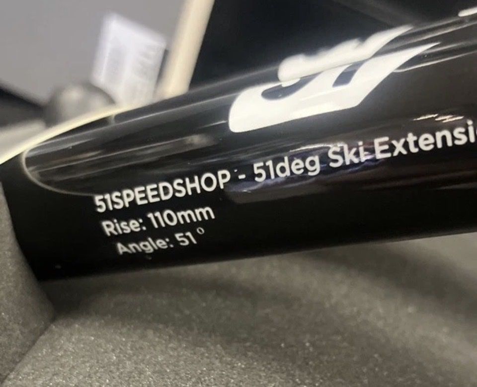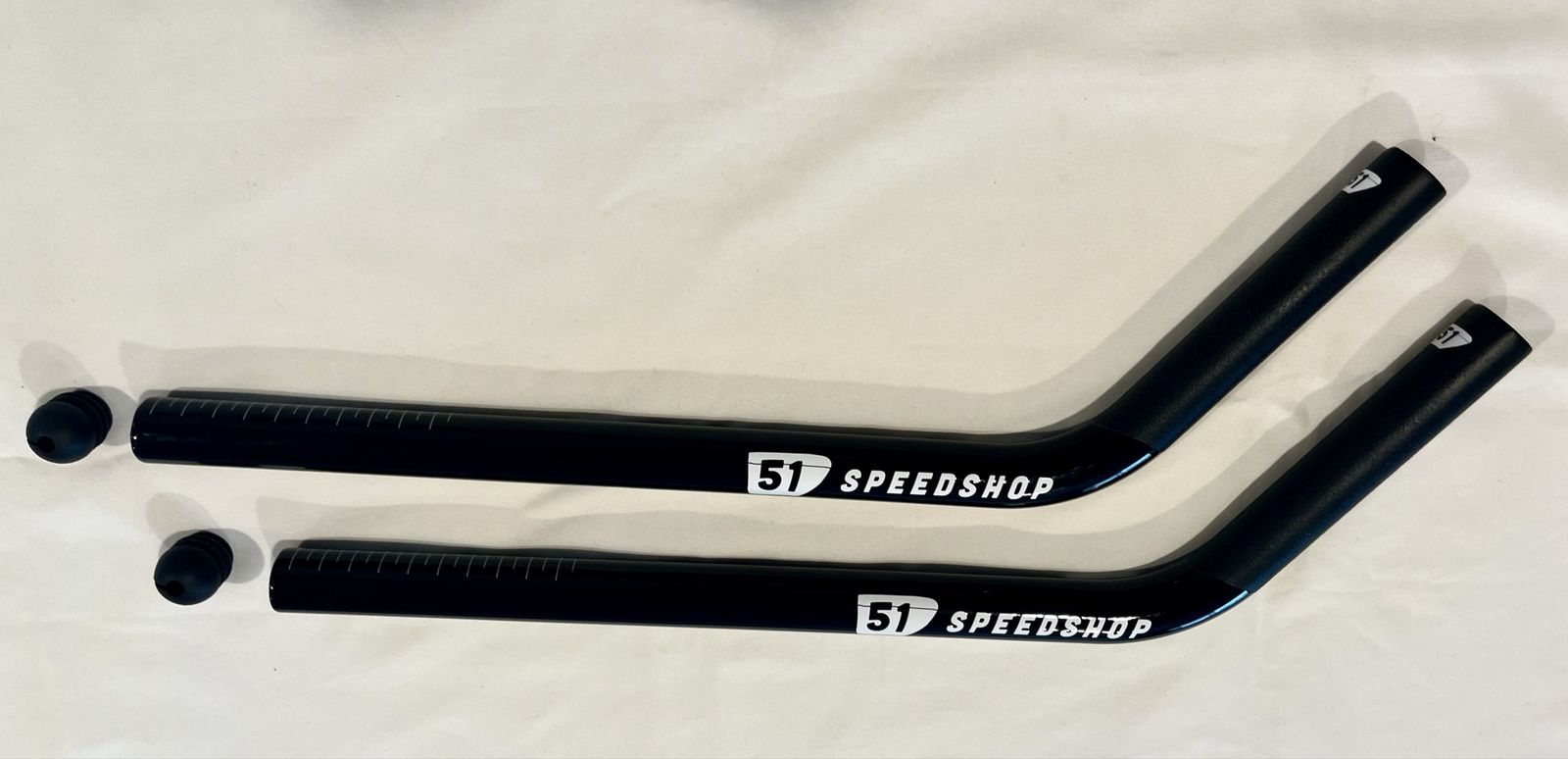 VenmoBrand:51 Speedshop Model: Ski Bend Carbon Aero Extensions Use: Time Trial, Triathlon Clamp Diameter: standard 22.2mm Rise: 110mm Angle: 51º Length: 410mm Weight: 135 grams (actual)