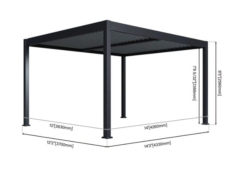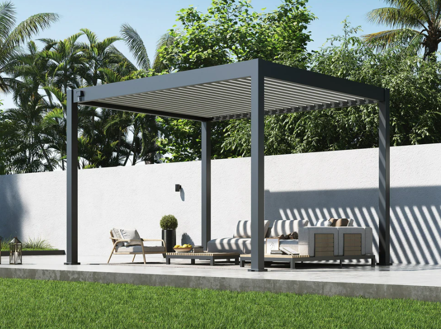 The two-tone Slate Gray and Light Gray finish adds a clean, contemporary look, while concealed hardware and a refined roof profile keep the design sleek from every angle. Larger sizes also include independent louver zones for personalized comfort across patios, pool areas, and outdoor seating.