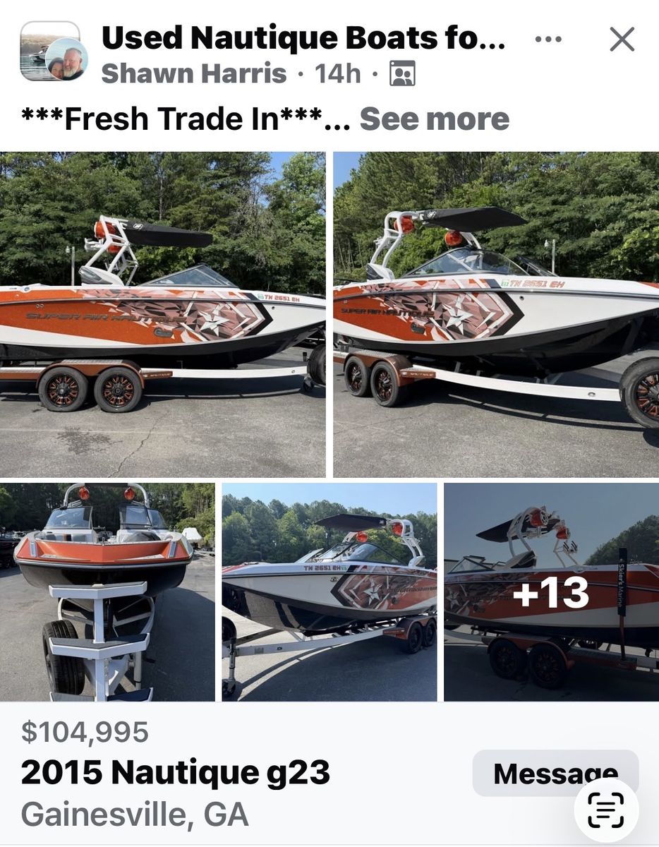 2015 Natique G 23 550 hp supercharged motor low hours. Very nicely equipped with NSS, underwater lights, tower speakers, board racks, custom cover, custom cover made for tower and speakers, surf exhaust, killer Stereo, new carpet on trailer bunks, almost new tires, custom wheels, heater and tons more. Most important is the 550 hp supercharged motor. Only 440 hours. This is the best boat you can buy. If you know you know. Boat is currently winterized. New engine impeller, new ballast impellers. Always serviced at the local Natique dealership through first owner. I am the second owner and knew the first owner. Very well maintained. You will not find a cleaner boat. Has Always been stored in garage. Absolutely perfect condition. Hit me up if you have any questions or want to come take a look at it sitting in my garage. Thanks, Jason. 801-598-7848 Title in hand for boat and trailer. $95,900 OBO