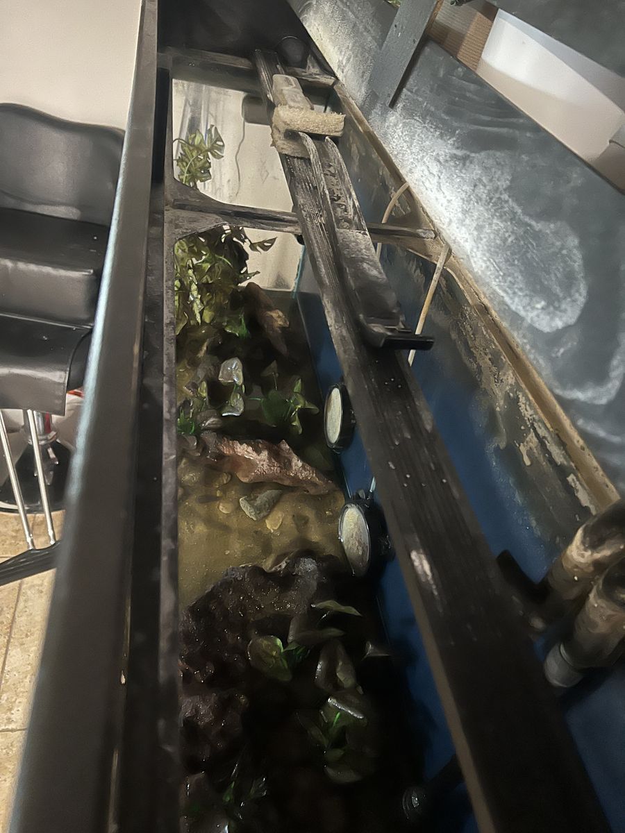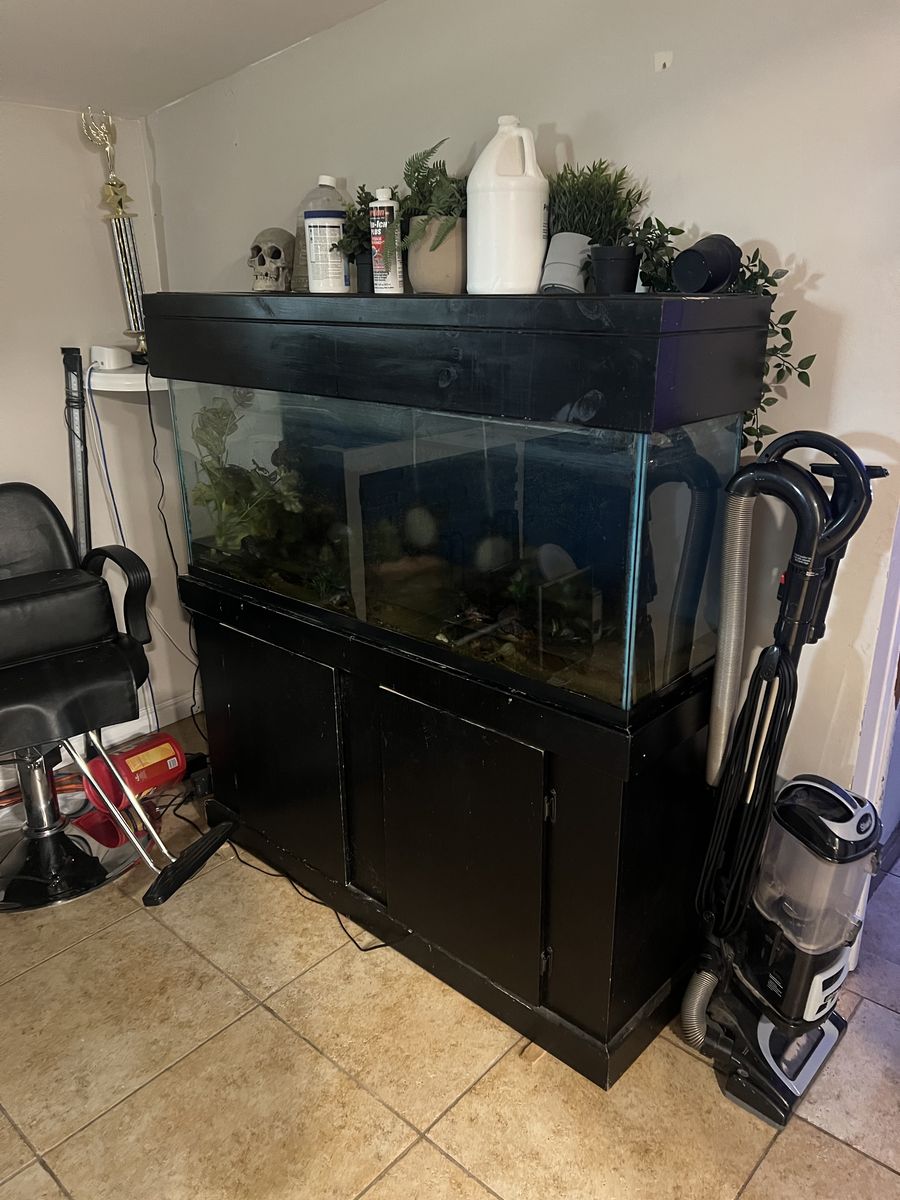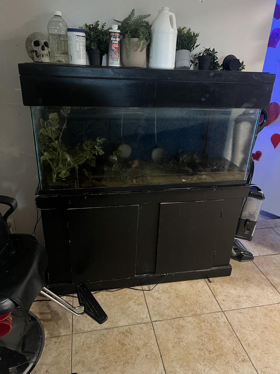ApplePay5 55 gallon aquarium and stand with cover this tank comes with everything inside their sand and lots of decor. Lots of natural decor. It comes with an air pump and two nice air stones also with a 48 inch LED Bluetooth connected light that works great and can operate from your phone.