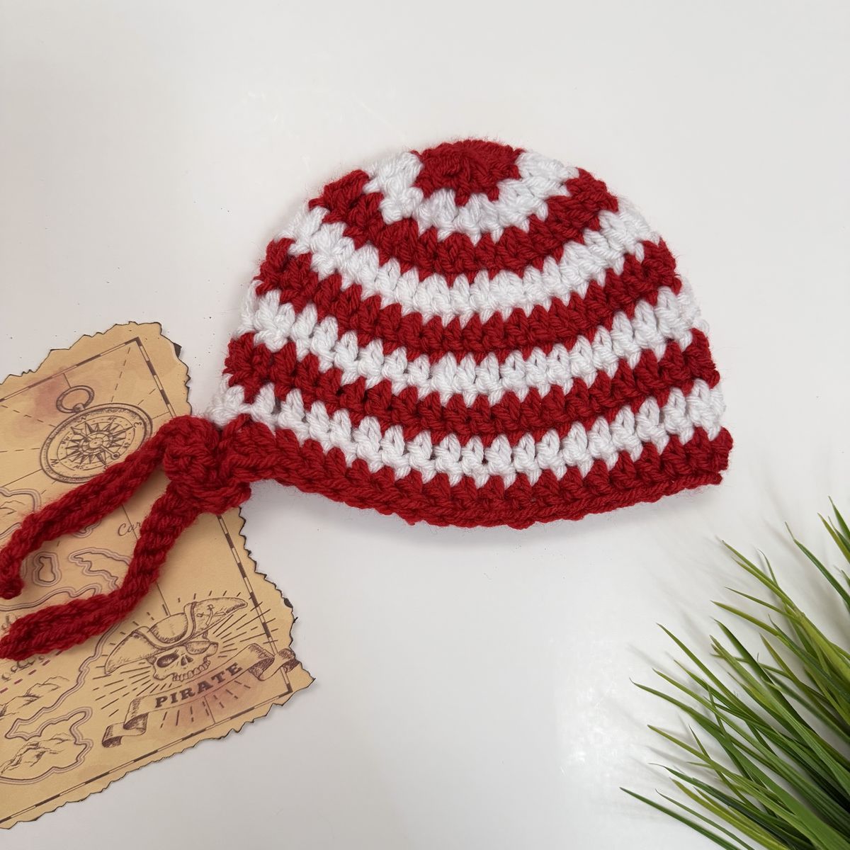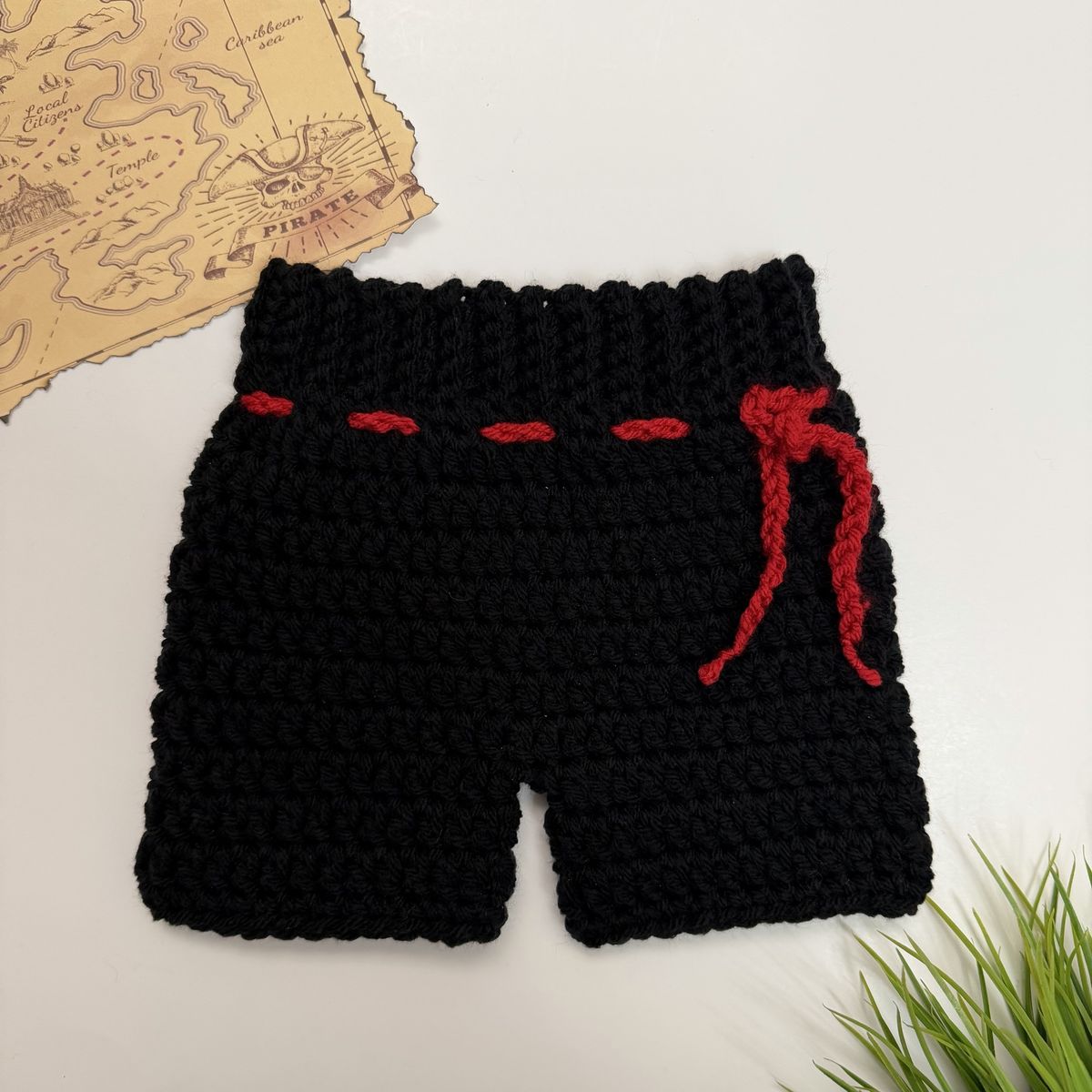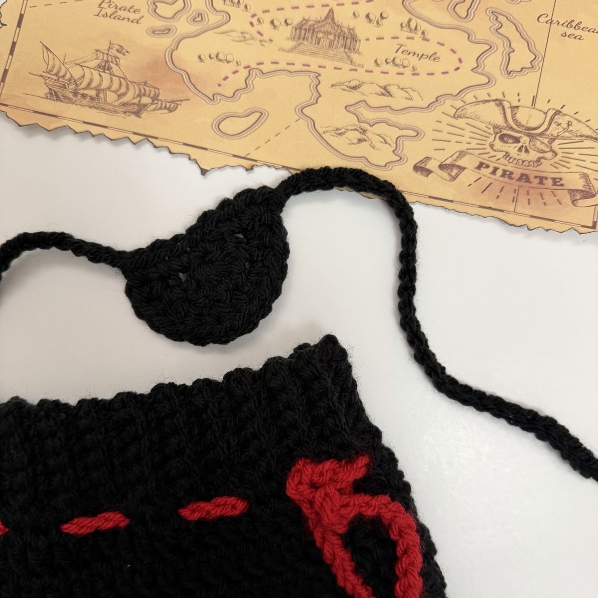 Baby Pirate Crochet Outfit Size: Newborn (13” waist & head circumference) Comes with hat, shorts and prop eye patch