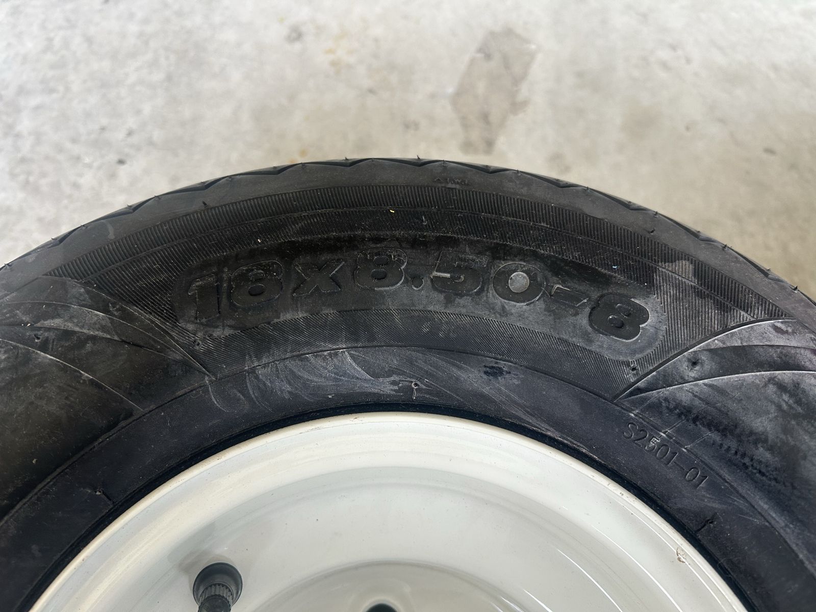 VenmoWhite Steel 8 in Wheel with 18 in GTW Topspin Plus Sawtooth Tire 18x8.50-8 Golf Cart Tires comes with two tires. Can drive to you for free.