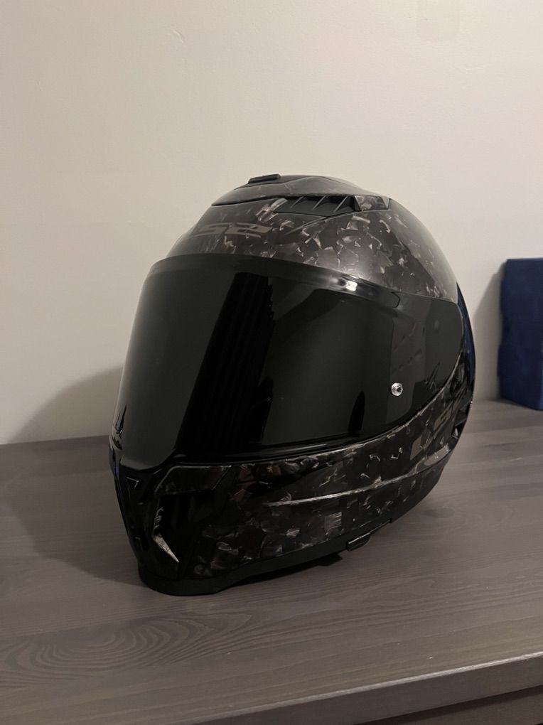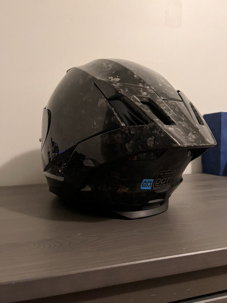 This is a brand new helmet. Only worn a couple times before realizing I need a size smaller, but didn’t realize there’s a no return policy. This is a size XL. Clear visor, tinted visor, box, and helmet bag are all included.