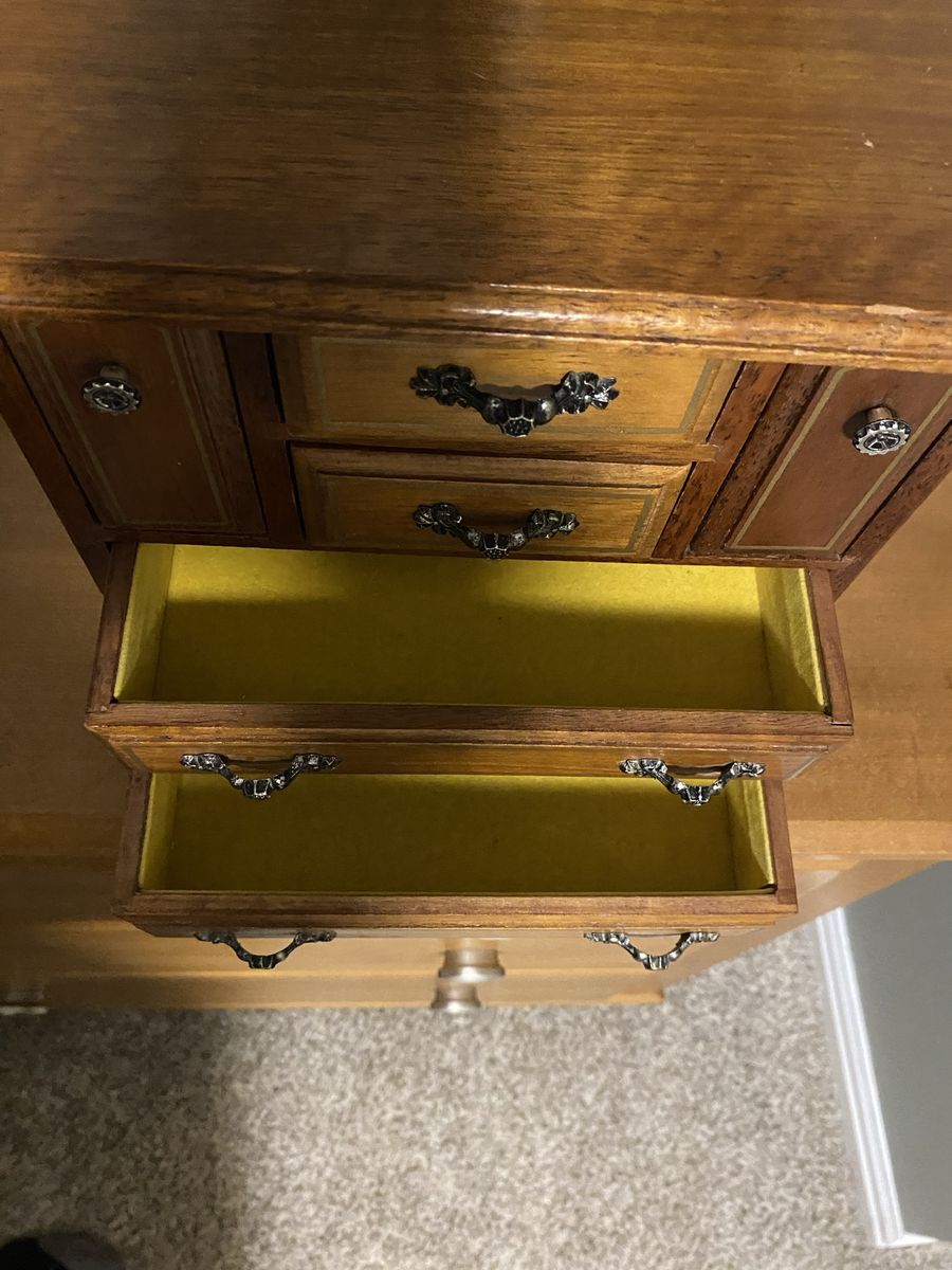 Ventage wood jewelry box yellow velvet interior heirloom music box is 9 1/2 x 9 1/2