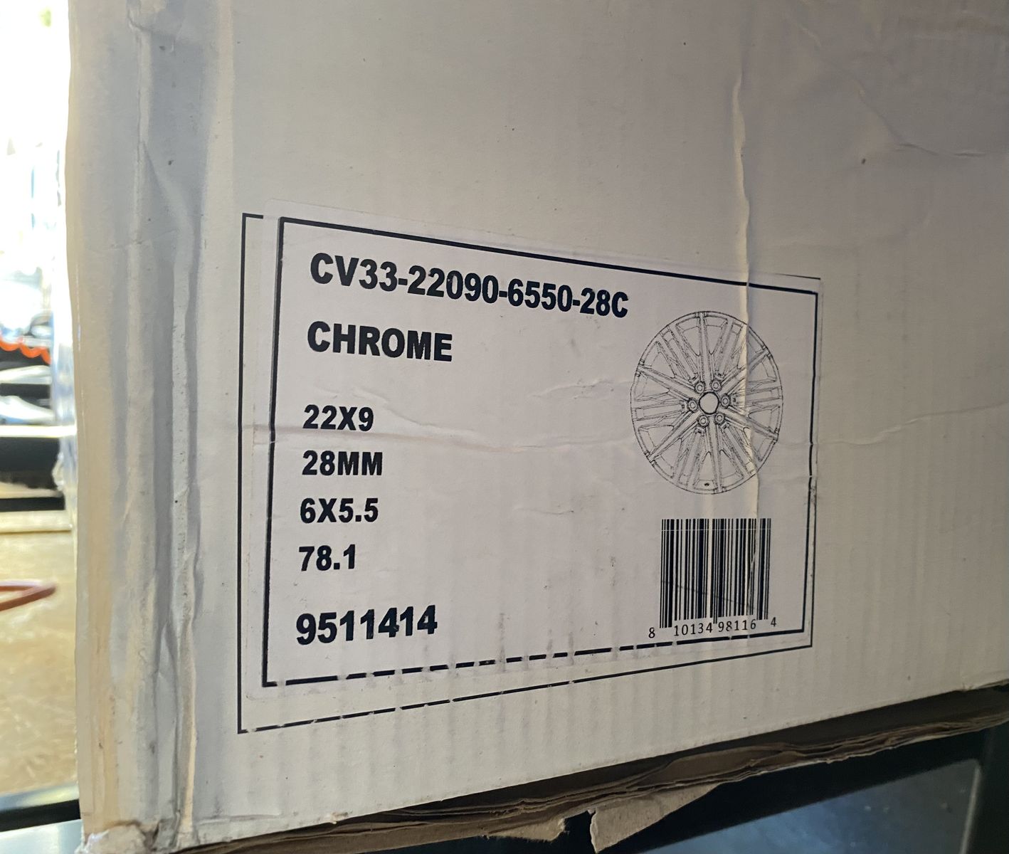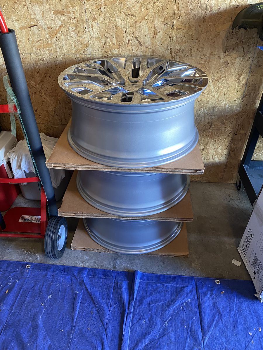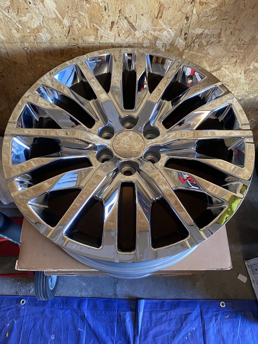 ApplePayBrand new 22” x 9” Rims. Never mounted. Will fit most large Chevrolet vehicles. The chrome is not tarnished but is the reflection of the plywood in the garage when photos were taken. I decided on a different style of wheel after purchasing these and it was too late and expensive to return them. I have the plain center caps and Chevrolet logo center caps but no valve stems, lug nuts, or TPMS sensors. $900 firm. Venmo or Apple Pay only.