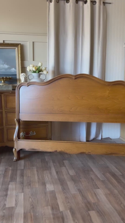 This stunning vintage Drexel French provincial bedroom set brings timeless elegance and cohesive charm to any space, featuring a beautifully crafted full size bed, matching nightstand, and spacious dresser. The bed showcases a gracefully curved headboard and footboard and comes complete with side rails and slats, ready for use, and remains in good vintage condition with minor wear that adds to its character. The nightstand offers both style and function with its smooth gliding drawer, original French hardware, and an open lower shelf perfect for added storage or styling with a basket or décor, while showing authentic vintage wear that enhances its charm. The dresser is a true statement piece, featuring multiple spacious drawers with original hardware that open and close with ease, and a refinished top sealed with lacquer for a fresh, durable finish while maintaining its vintage appeal. Together, this Drexel set is a rare and beautiful find that effortlessly blends classic French design with everyday functionality!