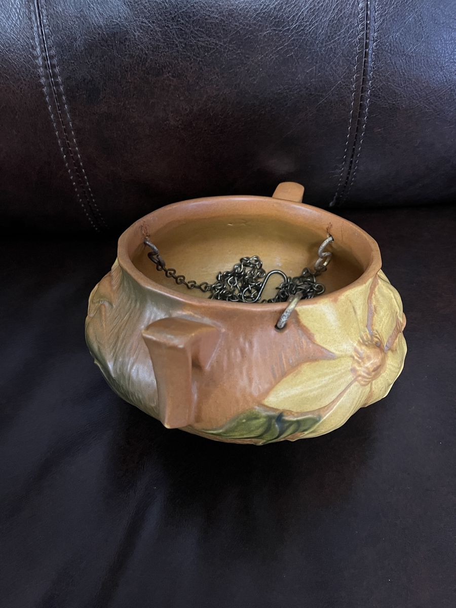 VenmoThis is a stunning antique Roseville Clematis pattern hanging planter. Research showns this was made about 1944. It was made by the Roseville Pottery Company in Roseville, Ohio. They are known for making quality pottery. This lovely pattern boasts of a unique arts and crafts/mission style design. Roseville made their pottery with a high quality stoneware and finished it with a matte finish. It has golds, browns, and greens, all colors found in nature. It is marked 'USA' up by the top rim. This is complete because it even comes with the chains to hang it. This measures 5 inches tall x 8 1/4 inches across. The inside opening is 5 1/8 inches. The chain is 28 inches long. This wonderful basket is about 80 years old. There are two tiny surface nicks and one small nick on the handle. All shown in the pictures. Selling this for a parent. No trades. The price is firm.