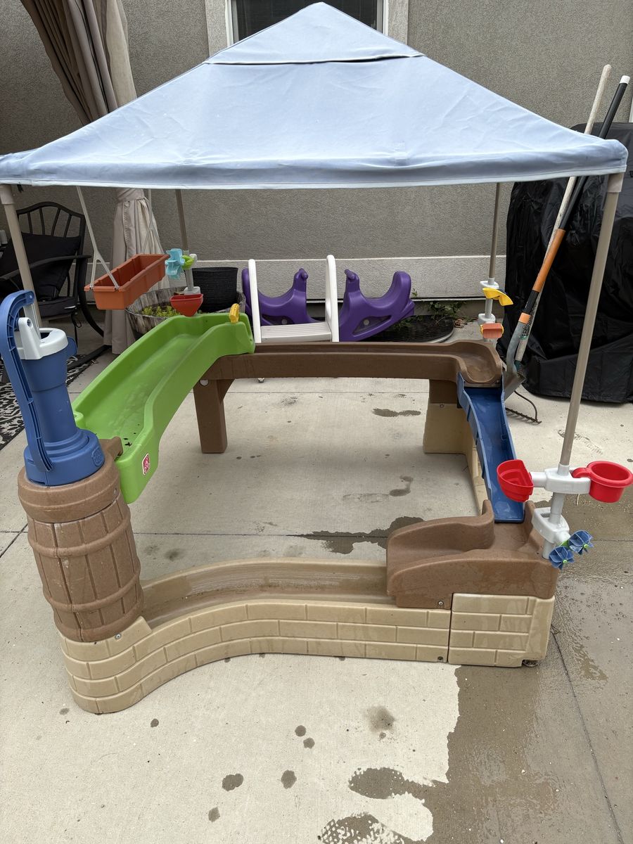 VenmoSuper fun water table, my kids have loved this. I just replaced the pump for the summer but my daughter says she is no longer interested in this toy. Still has almost all of the pieces and the canopy is faded but still has another 1-2 yrs in it. There is a very small tear in it which is pictured. Firm on price. Brand new this runs $260 on amazon.