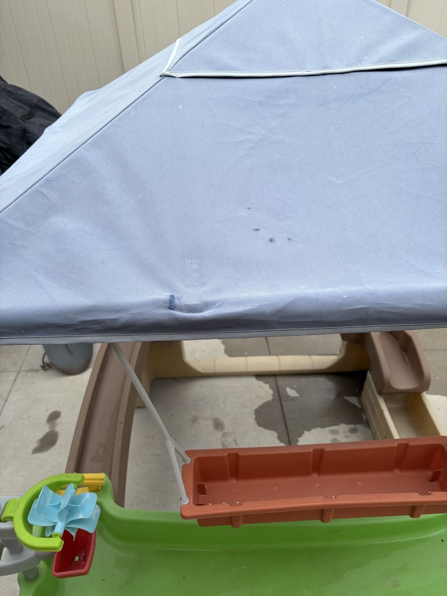Super fun water table, my kids have loved this. I just replaced the pump for the summer but my daughter says she is no longer interested in this toy. Still has almost all of the pieces and the canopy is faded but still has another 1-2 yrs in it. There is a very small tear in it which is pictured. Firm on price. Brand new this runs $260 on amazon.