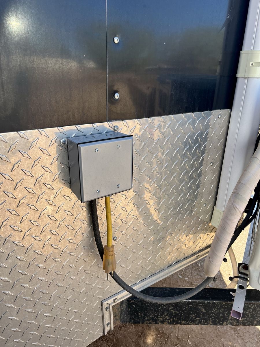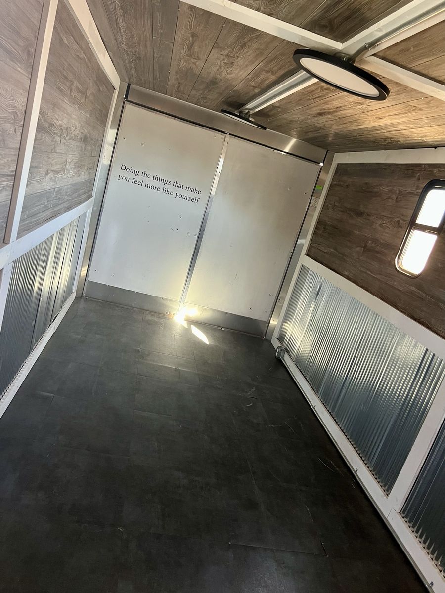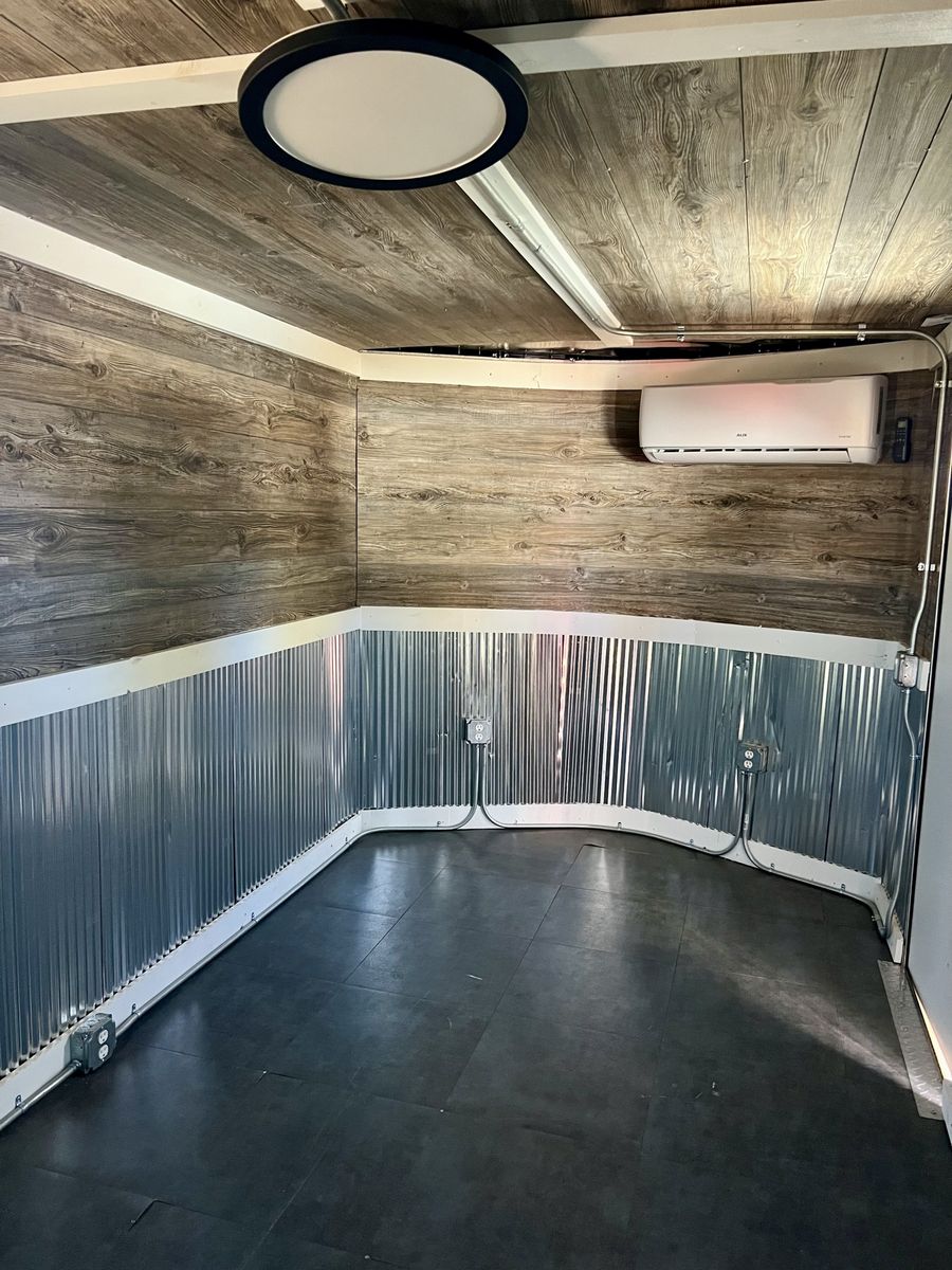 OBO Has a mini split installed for heating and cooling, 4 electrical outlets, two ceiling lights with a dimmer switch. 16’ but 18’ at the nose. Double axel with breaks.
