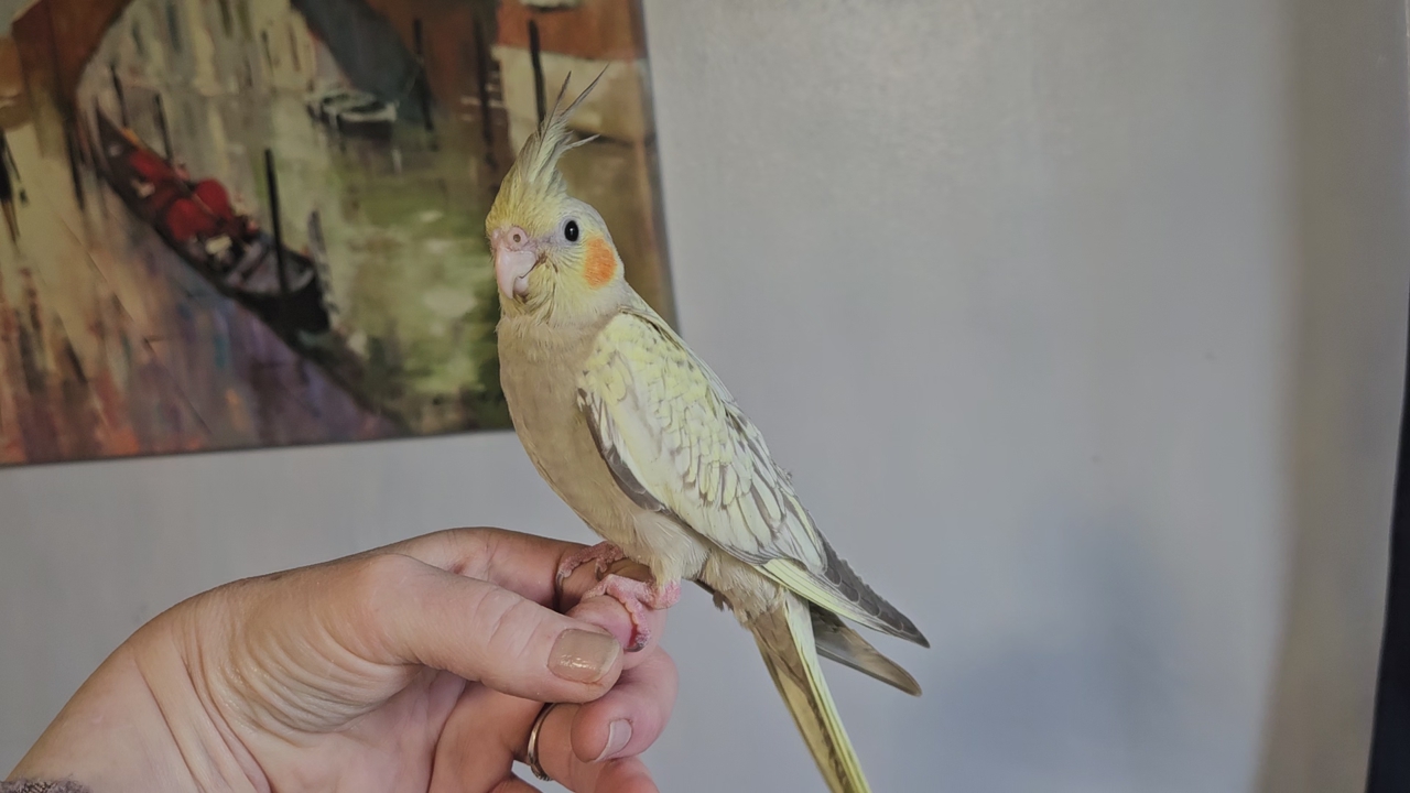 Beautiful 2 month old baby Cinnamon Pearl Cockatiel is ready for a good home. Was hand fed and now eating good on its own. Is very tame and will sit on your hand. I am unsure of the gender.