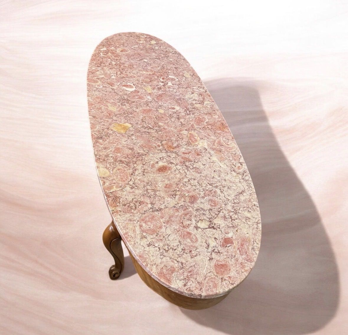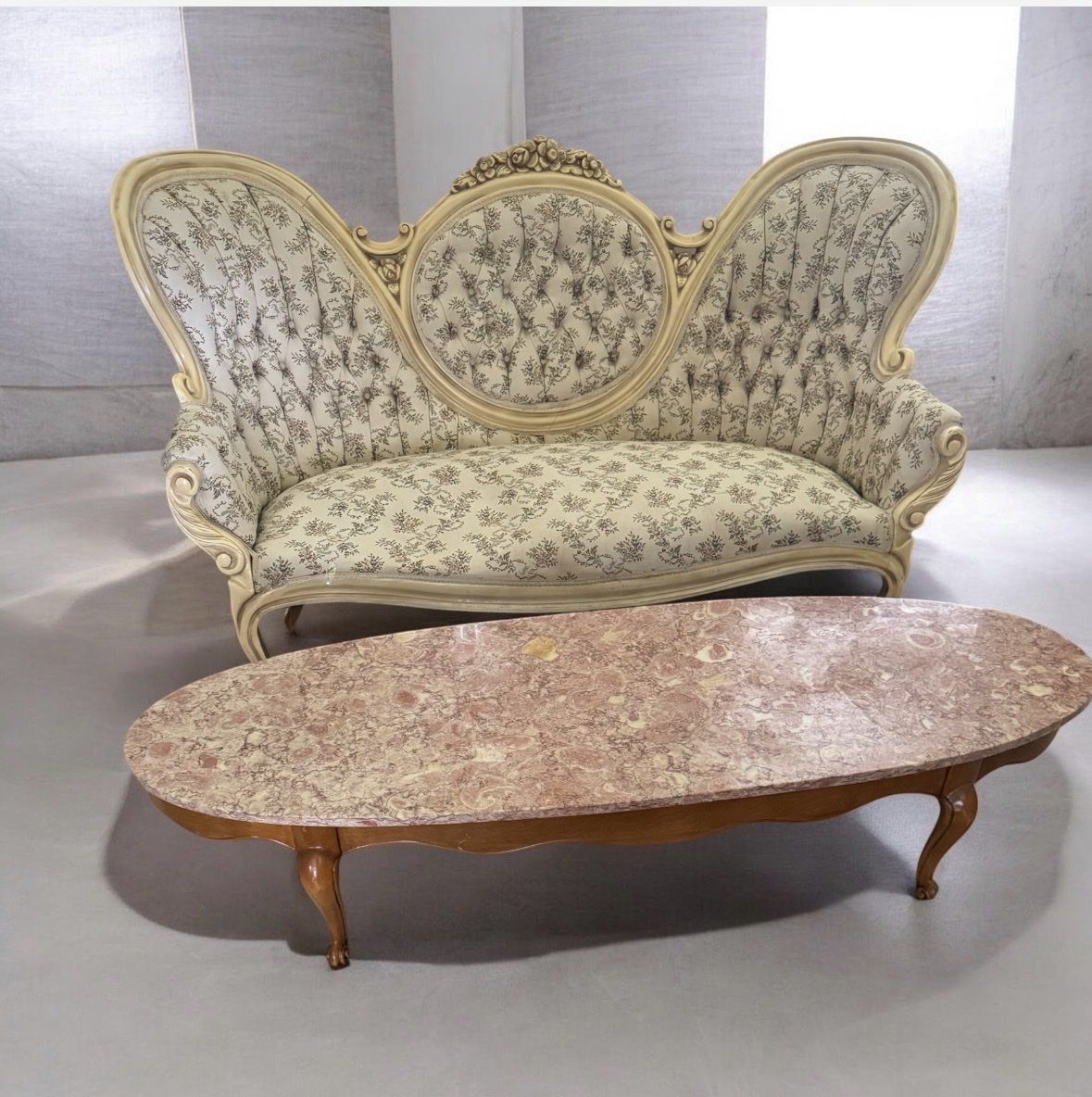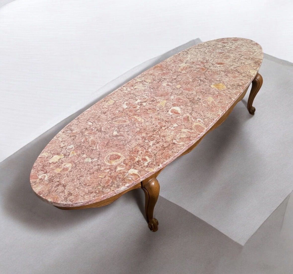 VenmoThe table in the image is a French Provincial Louis XV-style coffee table featuring an oval marble top and carved wooden legs. 66” long 22” wide 14.5” tall, marble top