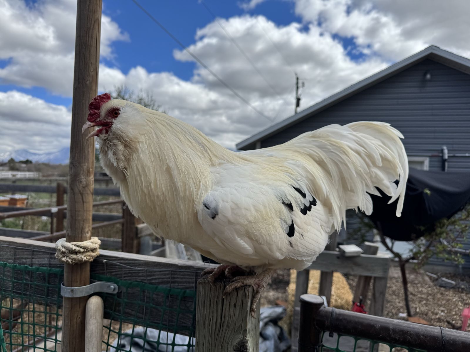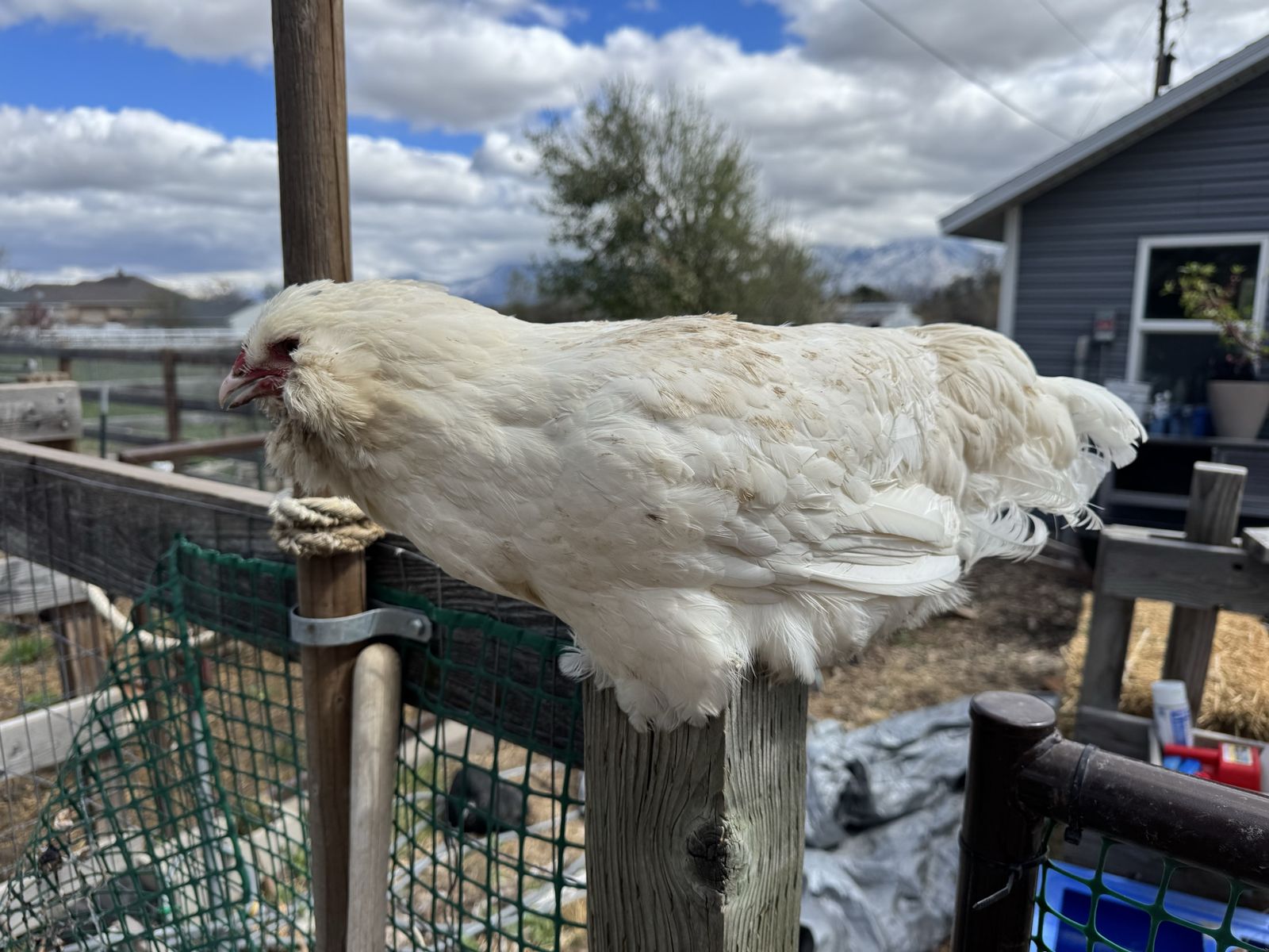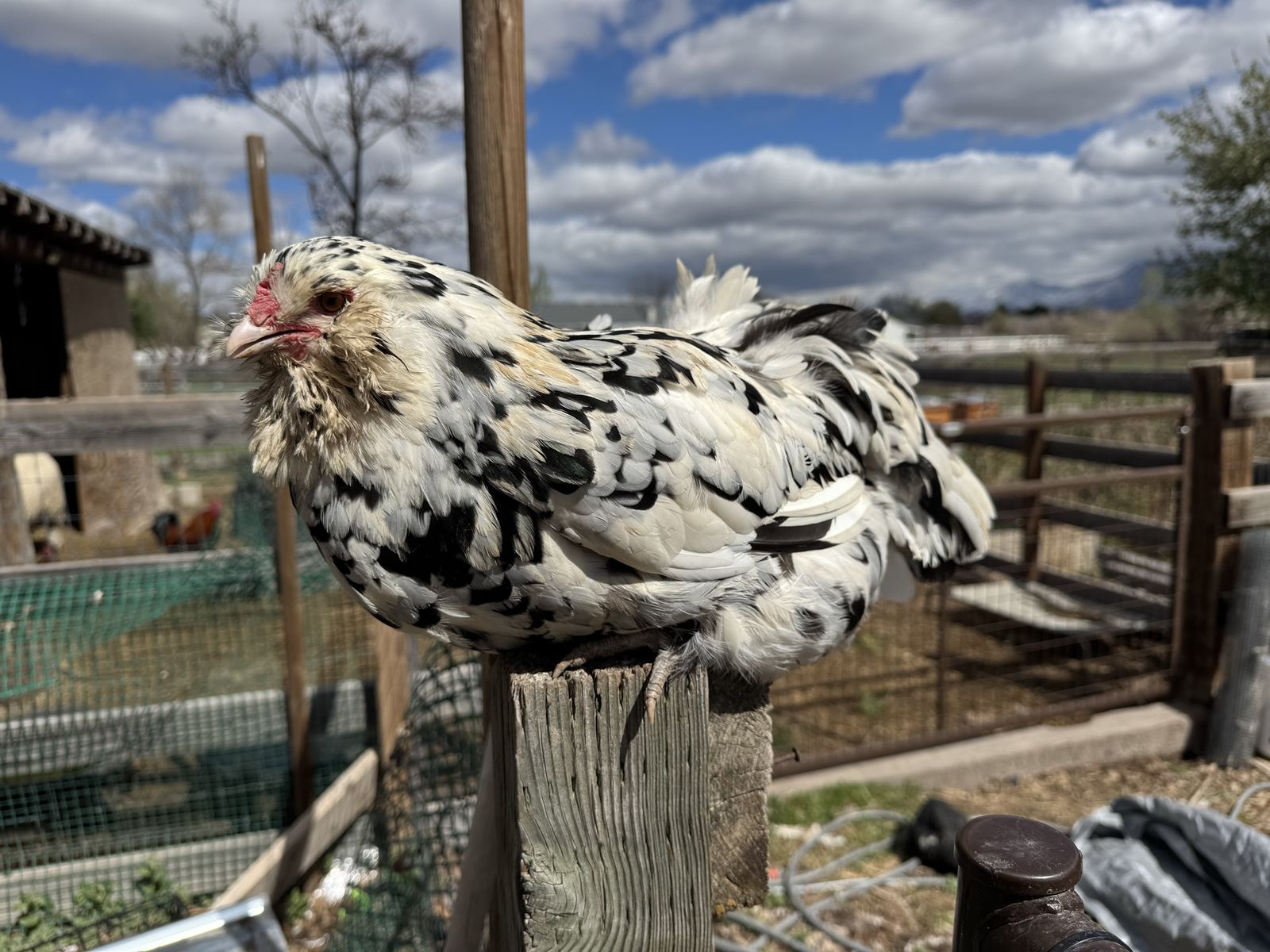 Amercaucanas are blue/green egg layers with fluffy cheeks/muffs and beards. They are generally pretty friendly chickens.