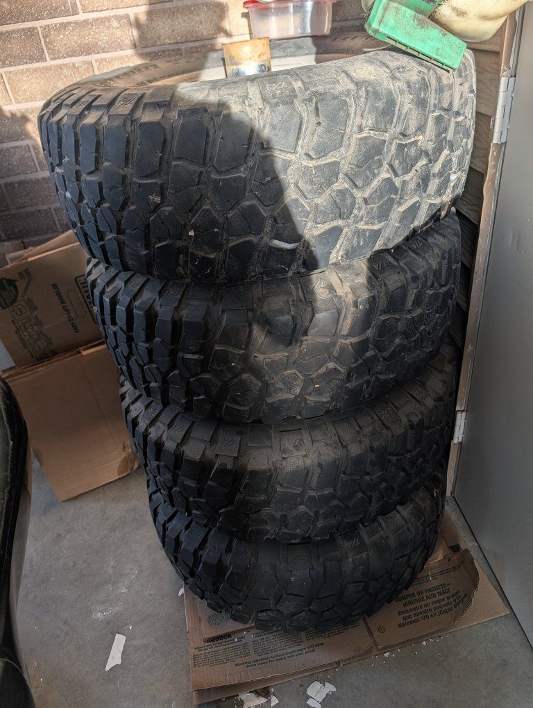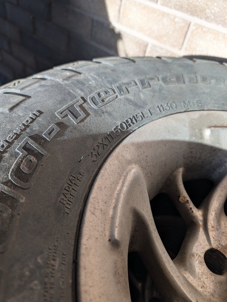 ZelleRugged set of four BFGoodrich Mud-Terrain T/A KM2 tires. These are size 32x11.50R15LT. Tires have deep tread remaining for off-road use. Sidewalls are black with raised lettering. Set includes four matching tires. (Idk how old they are) Open to offers or trades prefer to sell them though since I need to fix my truck.