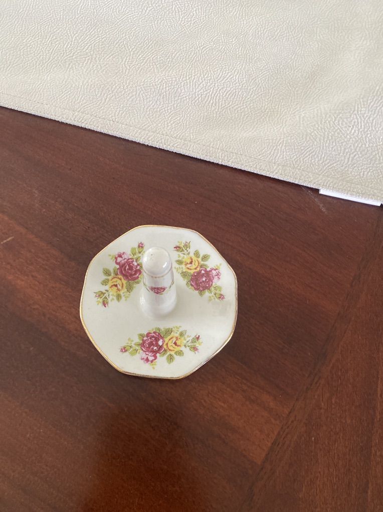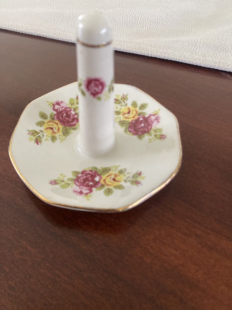 Vintage Porcelain Ring Tree, Vanity Decor, pink & yellow Roses, Gold Trim